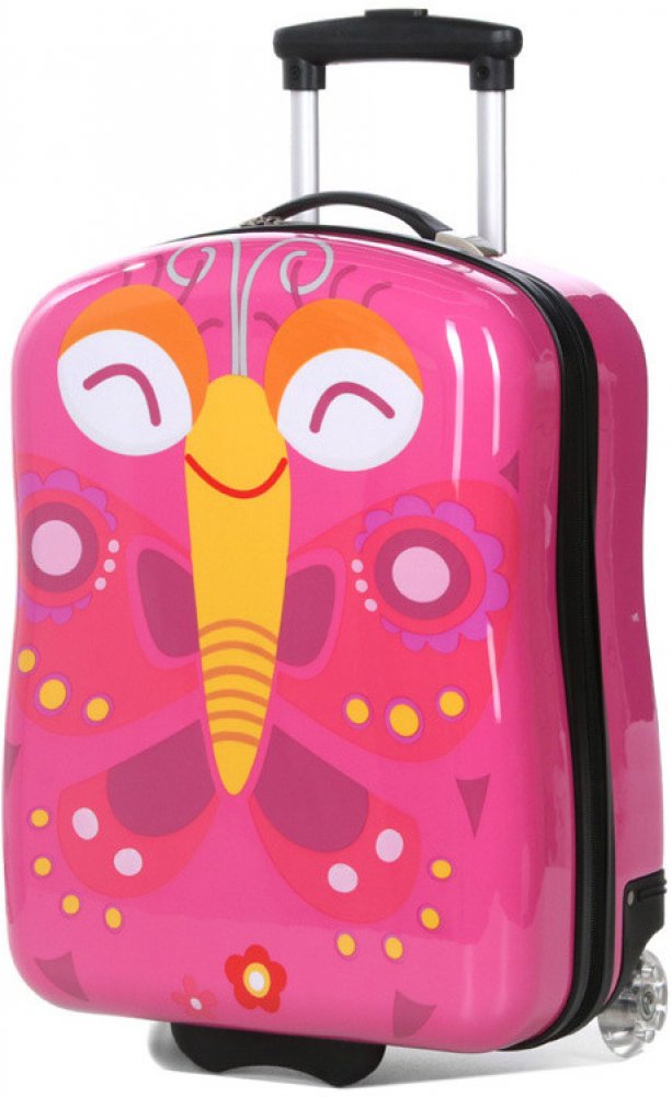 Dětský plastový kufřík na kolečkách francouzské značky Snowball s výsuvným madlem v růžové barvě s motivem motýla.