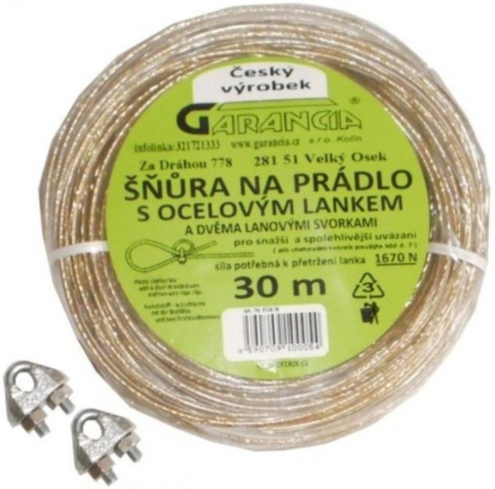 Prádelní šňůry v délkách 10m, 20m, 30m. Ocelové kordové lanko se dvěmi ocelovými svorkami.