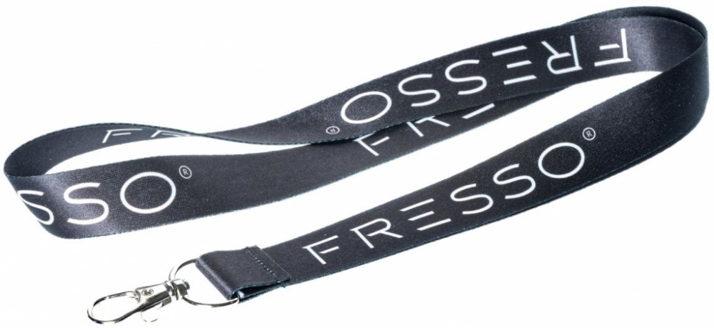 FRESSO Lanyard je stylová černá klíčenka na krk s motivem výrobce parfémů a autokosmetiky FRESSO.