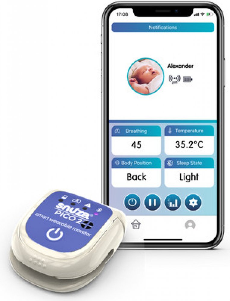 NOVÝ A VYLEPŠENÝ Snuza Pico 2 je bezkontaktní přenosný monitor pohybu, který sleduje nejen dýchání vašeho dítěte, ale i jeho spánkové návyky, polohu, teplotu či frekvenci dýchání pomocí aplikace ve vašem chytrém telefonu. Vše, co potřebujete ke sledování svého dítěte pomocí chytré technologie.
