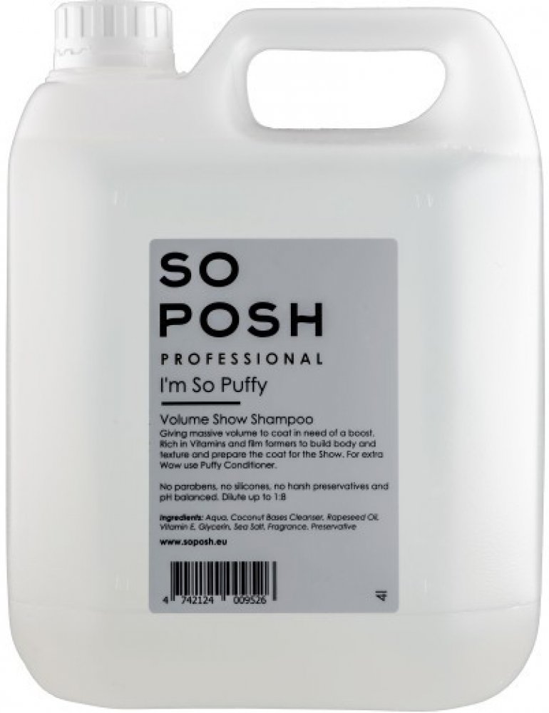 Tento šampon dodává srsti dokonalý objem. - šampon srst hloubkově čistí - je bohatý na vitamíny - obsahuje složky, které vytvářejí tvar a texturu - vhodný i pro psy s alergií, svědivou pokožkou a lupy - pomáhá předcházet lupům Neobsahuje parabeny, silikony a má vyvážené pH. Použití: doporučené ředění 1:8. Šampon do srsti vmasírujte a potom opláchněte. Pro dosažení ještě lepšího výsledku použijte kondicionér SO POSH Puffy. Varianty: 300ml / 1L / 4L