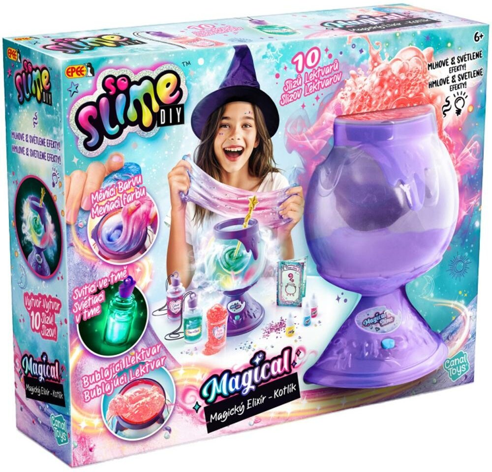 Nová řada slizů Magický elixír od populární značky So Slime! Sada Kotlík ti umožní vyrobit si 10 magických elixírů ze slizu ve skutečném kouzelném kotlíku se světelnými a mlhovými efekty. Postupuj podle receptů a vyrob si třeba elixír měnící barvu, svítící ve tmě nebo bublající lektvar. Stačí přidat do kotlíku prášek na sliz, elixír, dekorace a zamíchat pomocí kouzelné zlaté hůlky. Hotové slizy...