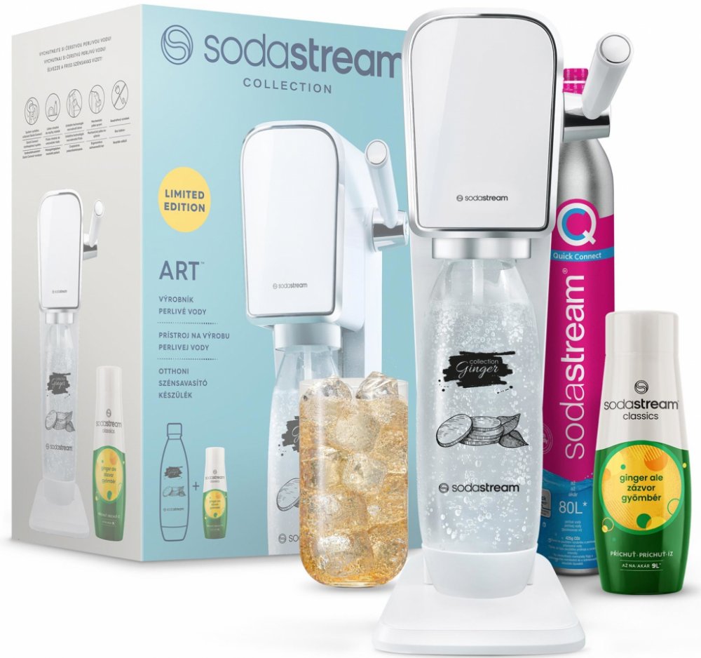 Designéři vymysleli špičkový výrobník sody SodaStream ART, inspirovaný uměním, nyní v exkluzivní edici GINGER ALE a v bílé barvě, klade mimořádný důraz na eleganci a jedinečnost jeho vzhledu. Mechanická páka na pravé straně zajišťuje snadné, ruční ovládání. Lahve do výrobníku se vloží pouhým zacvaknutím. Nemusí se šroubovat. V balení najdete speciální znovu použitelnou lahev Fuse o objemu 1 litr vhodnou do myčky nádobí, v designu GINGER ALE, i novou bombičku se systémem rychlého uchycení Quick Connect. A navíc zdarma je sada doplněna o koncentrovanou příchuť GINGER ALE - zázvorová limonáda, o objemu 440 ml. Příchuť je připravena dle receptury v koncentrovaném stavu a po přidání do perlivé vody si připravíte nápoj, tak jak ho máte rádi. Váš oblíbený nápoj si nyní můžete kdykoliv připravit v pohodlí vašeho domova. Vystačí až na 9 litrů hotového nápoje.