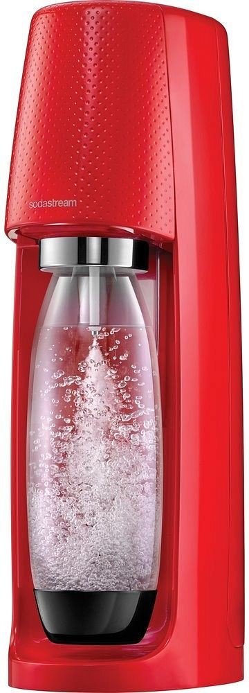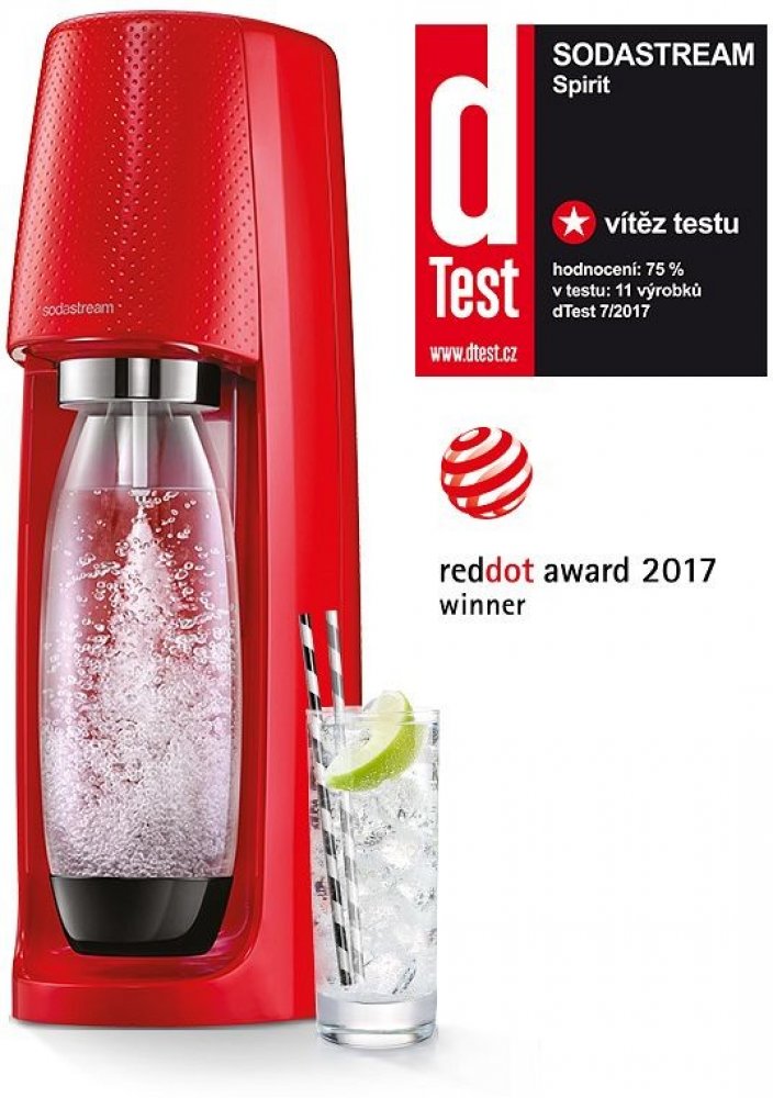 Přístroj Sodastream Spirit Red. Sada pro výrobu domácí perlivé vody. Obsahuje výrobník Spirit se samočinnou výrobou perlivé vody a nastavitelnou mírou perlivosti, odolnou plastovou tlakovou láhev a bombičku s náplní CO2 až na 80l domácí perlivé vody.