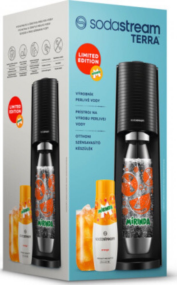 Limitovaná edice TERRA Black Mirinda Megapack – osvěžení s ikonickou příchutí! Hravý design, ikonická chuť a prémiové provedení! Výrobník perlivé vody SodaStream TERRA nyní přichází v limitované edici Mirinda, která přináší nejen osvěžující ovocnou chuť, ale také stylový vzhled. Elegantní černé provedení kombinuje matné a lesklé prvky, zatímco exkluzivní lahev se speciálním designem Mirinda poprvé obsahuje kovové prvky, které dodávají prémiový vzhled i vyšší odolnost. Navíc je sada zdarma doplněna o ikonickou příchuť MIRINDA o objemu 440 ml. Příchuť je připravena dle receptury v koncentrovaném stavu a po přidání do perlivé vody si připravíte nápoj, tak jak ho máte rádi. Váš oblíbený nápoj si nyní můžete kdykoliv připravit v pohodlí vašeho domova. Vystačí až na 9 litrů hotového nápoje. Lahve do výrobníku se vloží pouhým zacvaknutím. Nemusí se šroubovat.