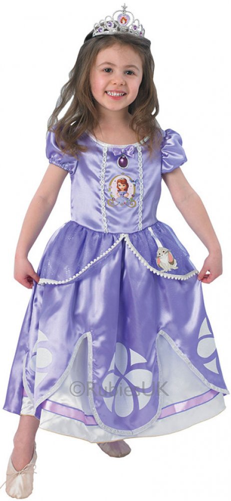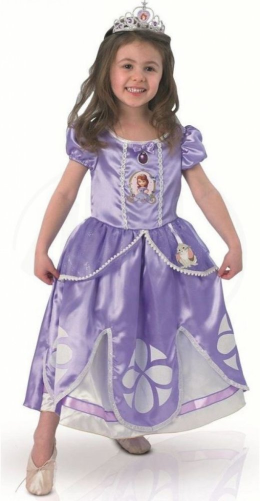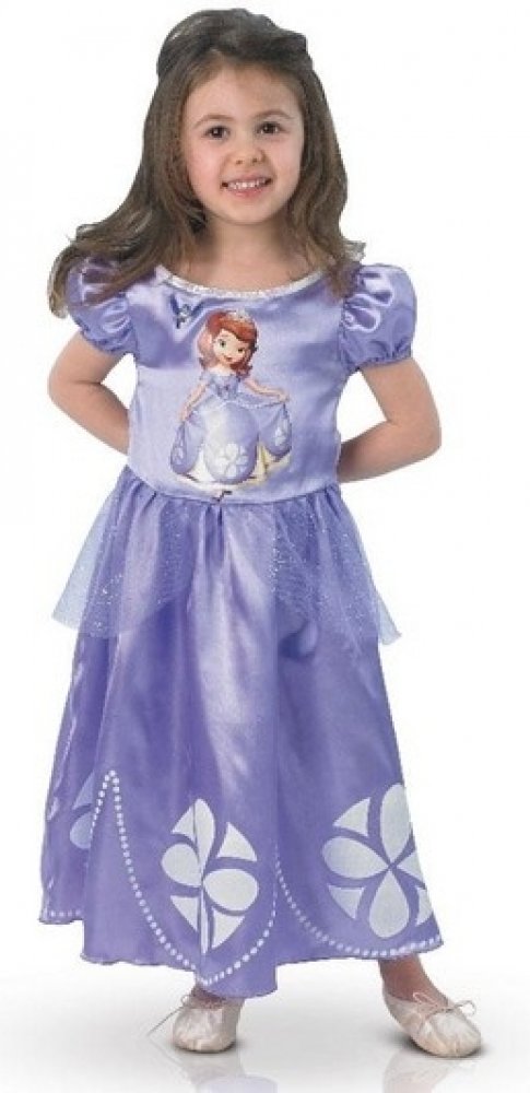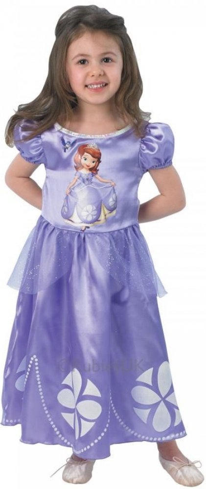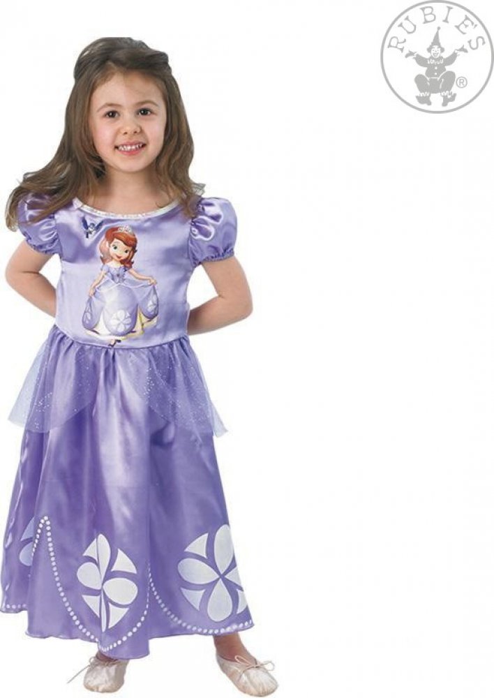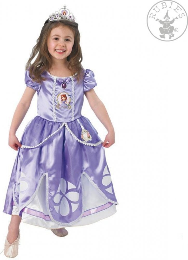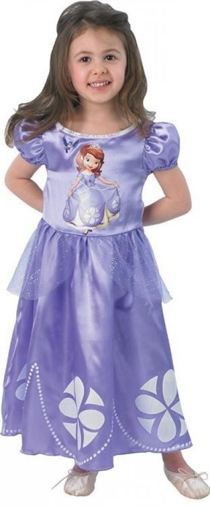 Fialové šatičky princezny Sofie. Šaty mají nadýchané rukávy a na hrudi je velký obrázek princezny Sofie.