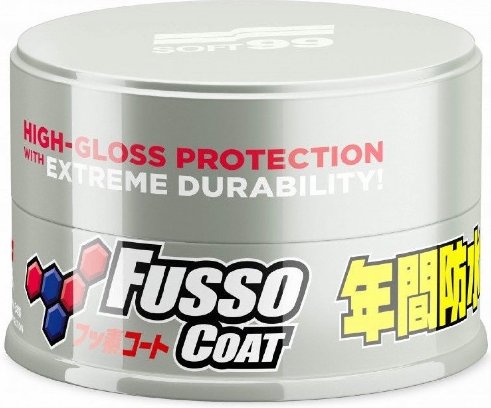 Fusso Coat od Soft99 je plněsyntetický vosk, založený na PTFE (Teflon). PTFE je polymer z fluoru a uhlíku s vysokou teplotou tání, který je vysoce odolný chemikáliím a velmi tenkou vrstvou odpuzuje zbytky jakéhokoliv druhu. Jeho využití známe z domácnosti, kde se používají teflonem potažené pánve. Zde jako základ autovosku slouží pro vysoký odvod vody a senzační beading s extrémně kulatým perlením...