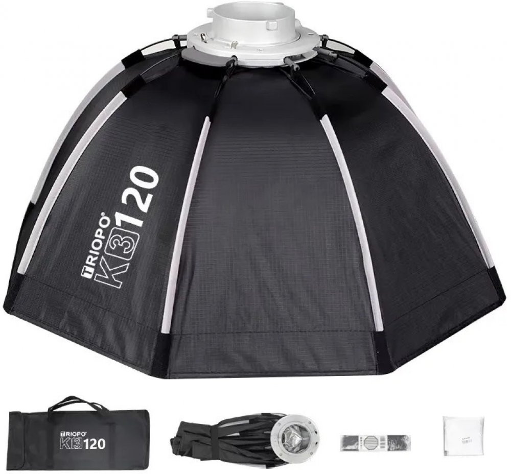 Softbox je určený hlavně pro záblesková světla. Systém Bowens Mount na který je možné namontovat většinu zábleskových i stálých světel. Průměr tohoto softboxu je 120 cm, hloubka 45 cm. Součástí balení je i voština ( grid ), difuzní plátno, přenosné pouzdro.