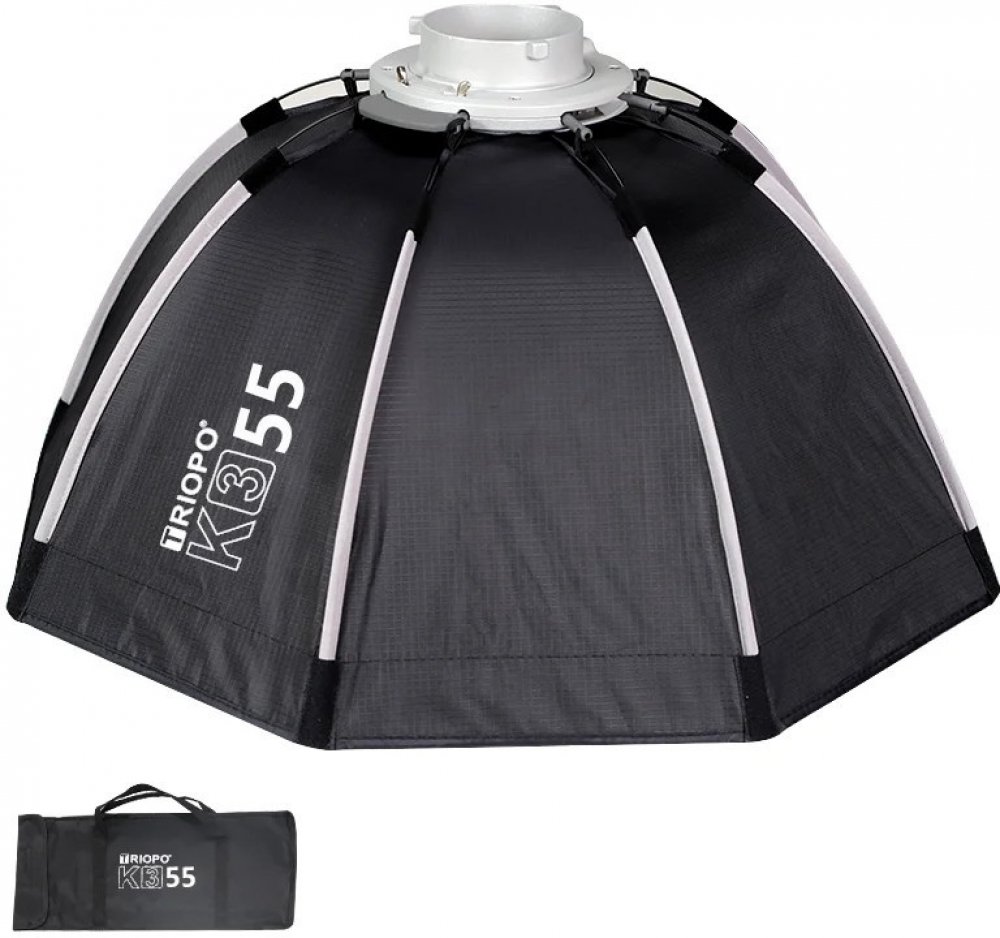 Softbox je určený hlavně pro záblesková světla. Systém Bowens Mount na který je možné namontovat většinu zábleskových i stálých světel. Průměr tohoto softboxu je 55 cm, hloubka 31 cm. Součástí balení je i voština ( grid ), difuzní plátno, přenosné pouzdro.