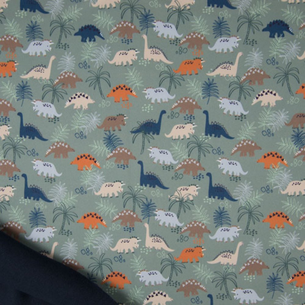 Zelený vzorovaný softshell, dinosauři v pralese. Látka je větruodolná, potpropustná a také nepromokavá. Softshell se používá na výrobu sportovních oděvů jako jsou softshelolové bundy a kalhoty. Svrchní vrstva softshellové látky je tvořena z hustě tkaného materiálu se zvýšenou odolností vůči oděru. Vnitřní vrstvu tvoří příjemná flísová vrstva, která uchovává teplo a zároveň umožňuje odvádět vlhkost ven. Složení látky 97% polyester + polyuretanová membrána (TPU) / 3% elastan. Šířka látky je 145 cm. Vodní sloupec: 10.000 mm. Prodyšnost: 3.000 g/m2/24h.