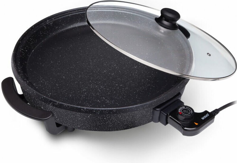 Pečící pánev. Průměr 42 cm. Perfektní pro pizzy, paelly, grilování, šťavnaté maso, pečení a jakékoliv jiné vaření. Termostat s nastavením teploty až 240 °C. Vysoce kvalitní nepřilnavý povrch Ceracook® s kamennou úpravou. Snadné čištění a skladování. Nízká spotřeba energie. Skleněné víko zajišťuje jak větší kontrolu nad vařením, tak i vyšší tepelnou odolnost. Příkon 1500 W.