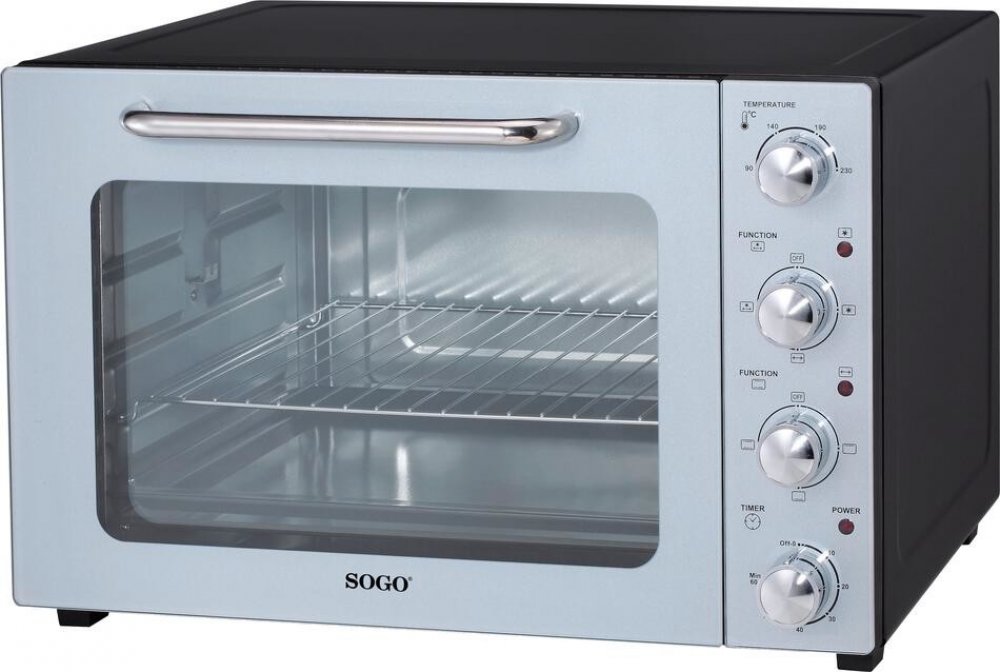Pečící trouba. 48 l. Elegantní design (celoskleněná přední stěna). Elektrická trouba s otočým rožněm, grilem a horkovzdušnou funkcí. Vnitřní osvětlení. 6 funkcí pečení. Termostat pro regulaci teploty od 90 °C do 230 °C. Časovač na 60 min, s automatickým vypnutím a zvukovým signálem. Madlo dvířek z nerezové oceli. 4 nerezová topná tělesa. Skleněné dveře z bezpečnostního dvojskla. Příslušenství: Pekáč na pečení, rošt, rožeň, rukojeť na rošt / plech, rukojeť na rožeň, vidlice, talíř na pizzu. Příkon: 1800 W