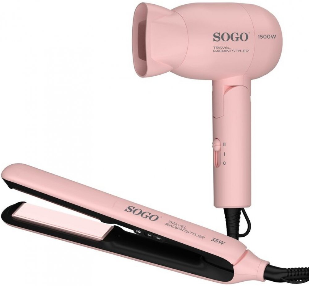 Cestovní SET 2v1, vysoušeč + žehlička na vlasy.Vysoušeč vlasů: výkonný DC motor, Lehký - pouze 0,35 kg 2 nastavení teploty, Ochrana proti přehřátí, Výkon 1500 W.Žehlička na vlasy: rychlé náhřátí, maximální teplota 200°C, desky s keramickým povrchem, vybaveno odporem (PTC), 360° otočný kabel, výkon 35 W.