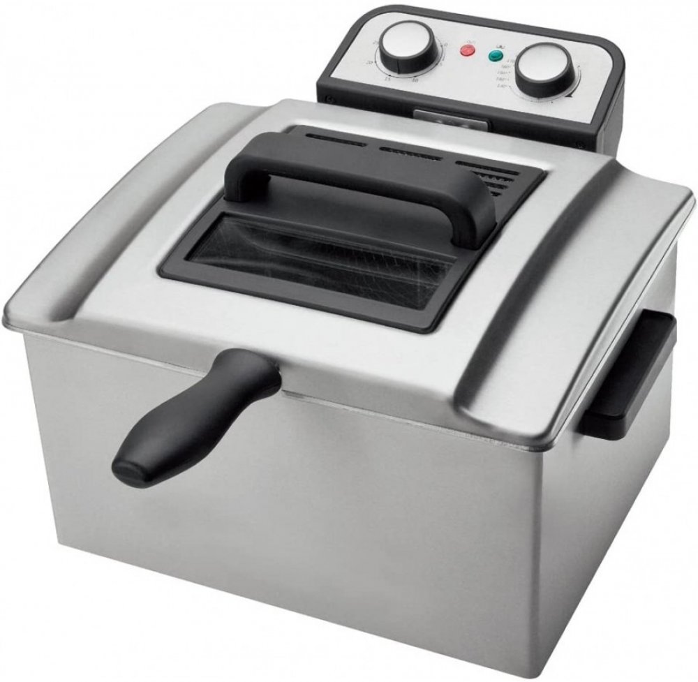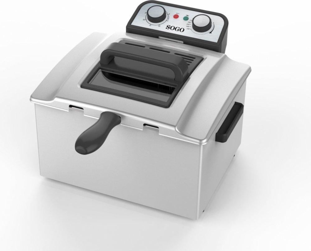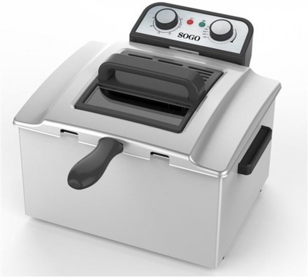 Fritéza SOGO SS 798 • kapacita 5 l oleje • 2 koše + jeden velký koš • technologie studené zóny • plynule regulovatelný termostat od 130 do 190 °C • 30min časovač • odnímatelná nerezová nádoba • víko s průzorem