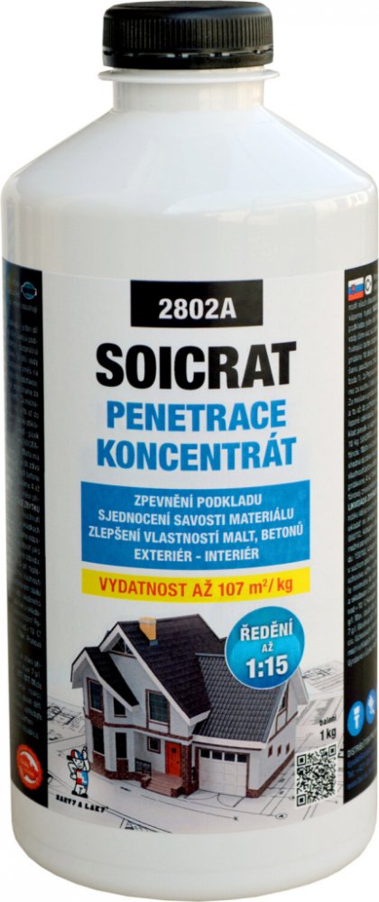 Univerzální penetrační nátěr na savé podklady (omítka, beton, dřevo atd.) pro snížení savosti a zároveň zlepšení přilnavosti vrchního nátěru disperzní barvou (Latex, Bakrylex email, Barlet akrylát, Bakrylex lak). Rovněž zlepšuje vlastnosti malt a betonů. Soicrat stavební penetrace se používá ke zlepšení vlastností všech stavebních směsí, které obsahují cement nebo vápenný hydrát nebo po naředění vodou jako penetrační nátěr. Vlastnosti penetrace 2802A: koncentrát ředění 1:15 vhodné do stavebních směsí zpevnění podkladu sjednocení savosti materiálu zlepšení vlastností malt, betonů balení 1 kg Technické vlastnosti koncentrované penetrace 2802A: jeden díl SOICRAT je možné ředit 3 až 15 díly vody (čím savější podklad, tím více ředíme) koncentrát ředění 1:15 vydatnost v závislosti na savosti podkladu a ředění 5 až 20 m2/kg způsob aplikace Podle způsobu použití. podklad omítky, stěrky, betony, samonivelační hmoty a jiné podklady prostředí interiér, exteriér odstín mléčně zbarvená kapalina Příklady pracovních postupů pro kocentrát penetrace 2802A: Penetrace savých podkladů: