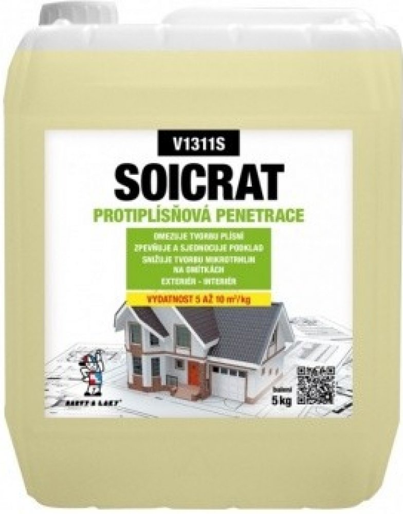 SOICRAT protiplísňová penetrace V1311S, 5 kg Preventivně omezuje tvorbu plísní díky aktivním fungicidním složkám. Používá se pro zpevnění podkladu, sjednocení jeho nasákavosti a zvýšení přilnavosti povrchu před nátěry.