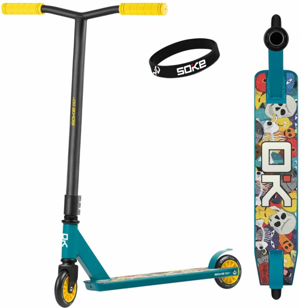Freestyle koloběžka SOKE GO! v žluto‑modrém provedení je navržena pro jízdu a triky ve skate parku. Široká 48,5cm řídítka ve tvaru „Y“ s back sweepem se volně otáčejí o 360° a poskytují vysokou stabilitu i jistotu při odrazech a dopadech. Gripy z měkčené TPR gumy o délce 145 mm dobře sedí v ruce a tlumí vibrace při jízdě.