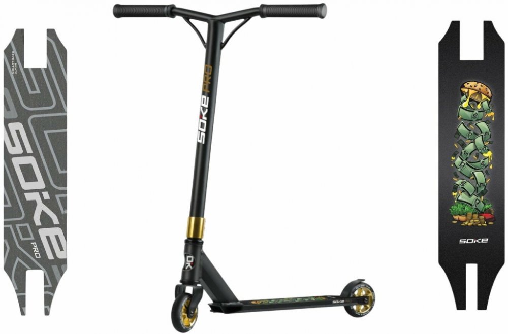Jednodílný deck (50 × 11 cm) s Peg‑cut tvarem a kvalitními svary je navržen pro pegy a jistý odraz. Rám z hliníku a železná řídítka doplňuje ocelová brzda a PU kola. Celková výška koloběžky je 85 cm a maximální hmotnost uživatele 100 kg. V balení najdete navíc griptape (šmirgl), kterým můžete snadno změnit vzhled. Jeden z griptapů je již z výroby nalepen – výběr je náhodný. Součástí jsou také značkové nálepky a černý náramek SOKE.