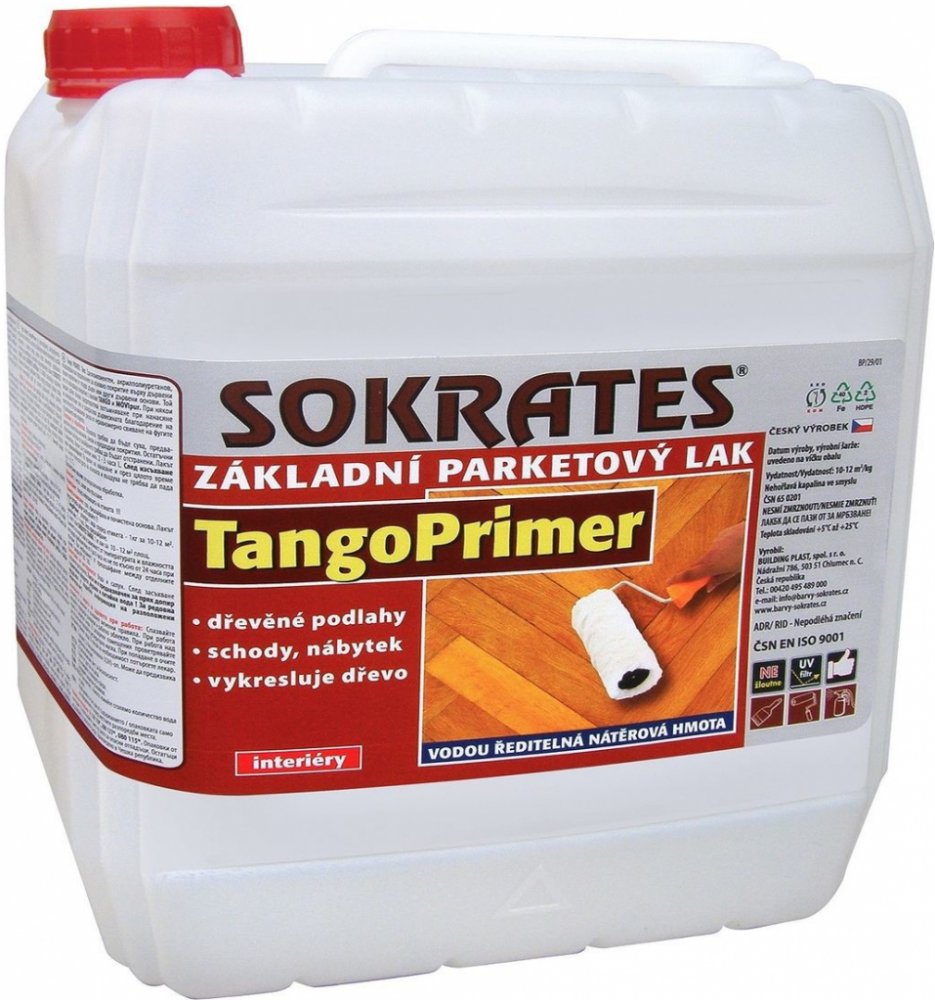 SOKRATES základní lak parketový je jednokomponentní. Je určený k základním nátěrům tvrdých dřevěných podkladů, dubových parket apod. pro vnitřní prostředí. Jako vrchní nátěr se používá polyuretanový lak TANGO nebo MOVIpur. Na obklady stěn jiný vhodný lak SOKRATES. Základní lak chrání dubové parkety před jejich tmavnutím při aplikaci vrchního laku TANGO. Základní lak při aplikaci MOVIpuru zvýrazňuje kresbu tvrdého dřeva do příjemného odstínu. Nanášení: válečkem, štětcem, stříkáním. Dále se neředí.