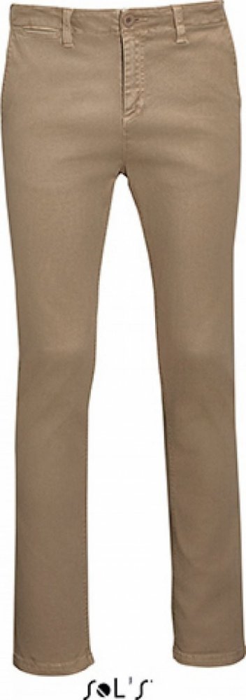 Pánské kalhoty tzv. chinos střihu. Poklopec se zapínáním na knoflíky. Díky poutkům umožnují nošení pásku. Vpředu mají dvě větší kapsy a jednu malou, na zadní straně pak další dvě. Užijete je do práce i při méně formálních společenských akcích. Skvěle vypadají s košilí či polo tričkem.