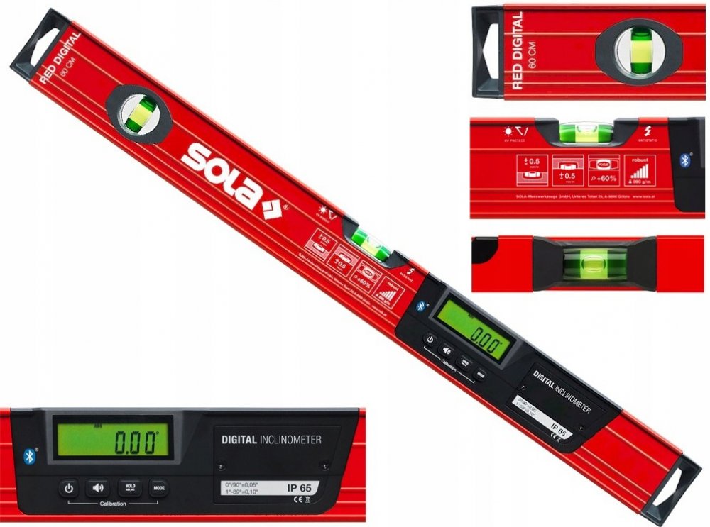 Provedení: Z hliníkového obdélníkového profilu, s práškovým povrstvením. Integrovaný bodový laser pro rychlý a snadný přenos referenčních výšek. Modul Solatronic k měření zkosení. Trvale osvětlený displej, otáčí se při obráceném měření, zobrazení ve stupních, procentech, mm/m a mnoho dalšího. Akustické navádění na cíl. Funkce přidržení (Hold) a automatického vypnutí. Přesnost měření libel: v normální a obrácené poloze 0,25 mm/m. Přesnost měření v elektronickém režimu: při 0° a 90°: 0,05°, jinak 0,1°. Tolerance laserového měření ±0,15 mm/m.