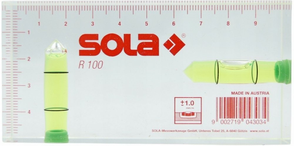 Vodováha z akrylového skla, 100 x 50 x 15 mm, 2 libely, 0-90° - SOLA R 100 - 01622142.Kapesní vodováha se dvěma libelami je určena pro přesné měření například u vodovodních a topenářských instalací nebo při kontrole vodorovnosti nábytku nebo obkladů.Vodováha je vyrobena z vysoce kvalitních materiálů, které zajišťují dlouhou životnost a přesné měření. Rozsah měření vodováhy je 0-90°. Technické parametry:• Rozměry: 100 x 50 x 15 mm• Počet libel: 2 • Rozsah měření: 0-90°• Materiál: akrylové sklo
