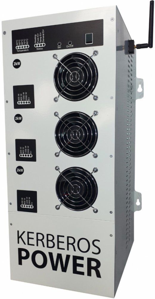 KERBEROS POWER je modulární systém výkonného fotovoltaického ohřevu vody. Je určen pro až ~8 kWp instalovaného fotovoltaického výkonu. Pracuje s běžnými topnými tělesy o výkonu 2 - 2,5 kW pro každý z maximálně 3 modulů. Voda se ohřívá výhradně solární energií, síťový přívod slouží pouze pro napájení řídicí části a komunikačního modulu. Výkonová část pracuje v ostrovním režimu, fotovoltaická část j...