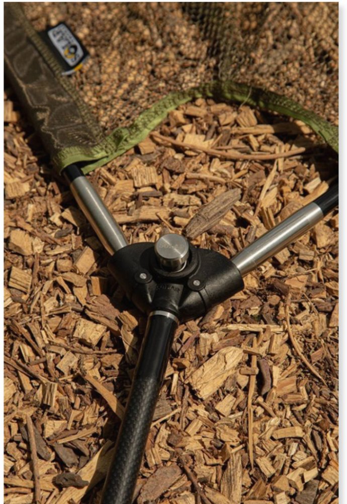 Rychloupínací blok je vyroben z polymeru se skleněnými vlákny a nerezové oceli – je lehký, silný a snadno se používá. Dvoudílná 3K karbonová rukojeť, skládající se ze dvou 90 cm sekcí, laserem upravená nerezová koncovka podběráku, ocelové kroužky u zakončení a na dotyk měkká rukojeť z japonského Shrink wrap materiálu se perfektně doplňují s hlubokou, měkkou sítí v maskovacím zbarvení. Ramena dlouhá 42“ jsou vyrobena z toho samého 3K tkaného karbonu, jako rukojeť a jsou zakončeny ocelovou koncovkou vyrobenou v Anglii. Podběrák je dodávám v nepropustném PVC obalu, který zadrží jak vlhkost, tak zápach.