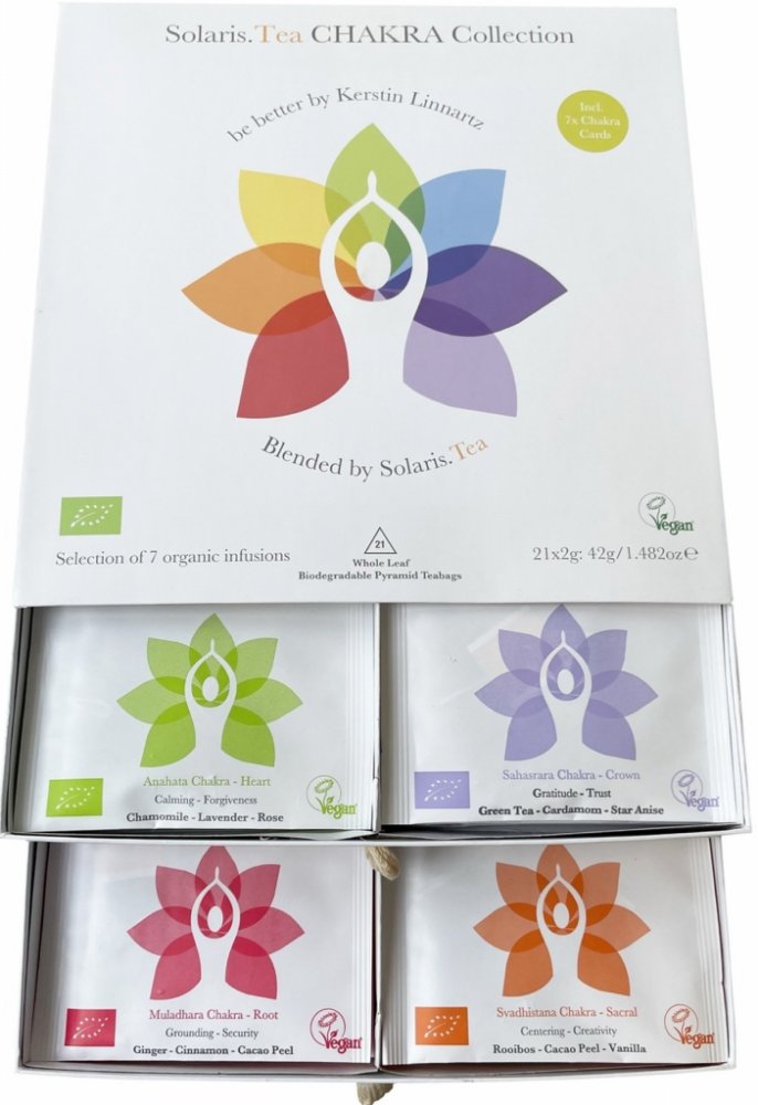 Solaris Botanicals Ltd. je rodinná značka z Irska, která propojuje bylinkářství a udržitelný životní styl. Kolekci be better CHAKRA vytvořila odbornice na jógu Kerstin Linnartz ve spolupráci s mistry čajových směsí. Výsledkem je čajová cesta, která vede k harmonii, vnitřnímu klidu a energii.