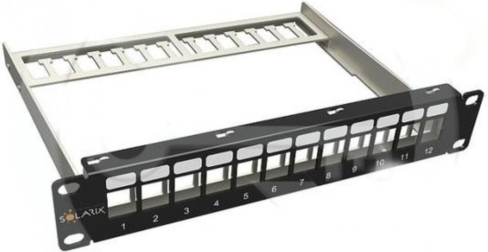Patch panel Solarix 10" modulární neosazený 12 portů 1U SX12M-0-STP-BK-UNI-N-10Univerzální neosazený 10" patch panel velikosti 1U určený pro 12 keystonů Solarix.