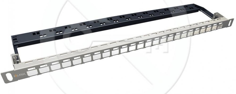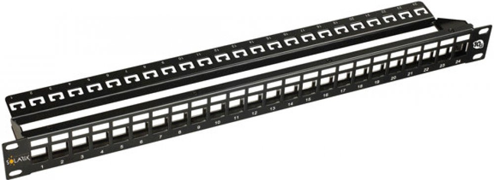 Neosazený patch panel s označením SX24HDM-0-STP-SL-UNI je univerzální vysokohustotní 19" modulární patch panel, který je určen pro 24 keystonů strukturované kabeláže Solarix. Panel je kompatibilní s keystony z produktových řad Solarix - kategorie 5E, Solarix - kategorie 6 i Solarix kategorie 6A, které mají svorkovnici otočenou dozadu (tj. témeř všechny keystony Solarix kromě SXKJ-5E-UTP-BK...