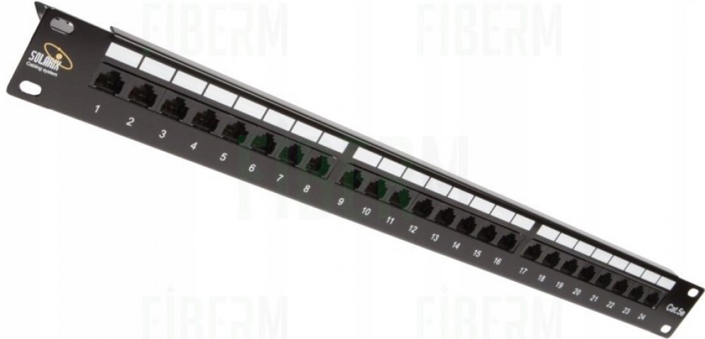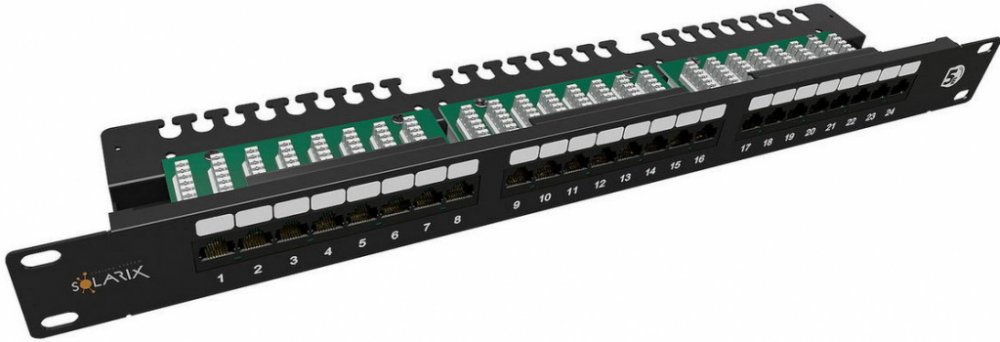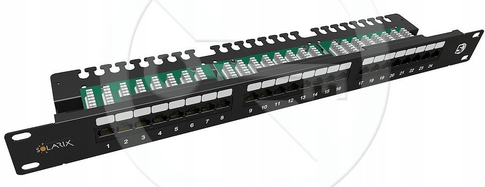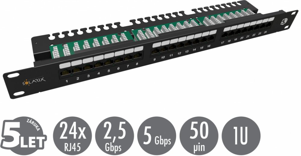 Patch panel Solarix s označením SX24L-5E-UTP-BK-N je panel osazený 24 porty RJ45, jehož součástí je vyvazovací lišta sloužící k přehlednému vyvázání a pevnému uchycení kabelů přímo k tělu panelu. Instalační kabel se zakončuje do duální IDC svorkovnice typu 110/Krone. Svorkovnice je z důvodu snadného zakončení kabelu označena podle standardu T568A i T568B. Stejně jako všechny ostatní komponenty str...