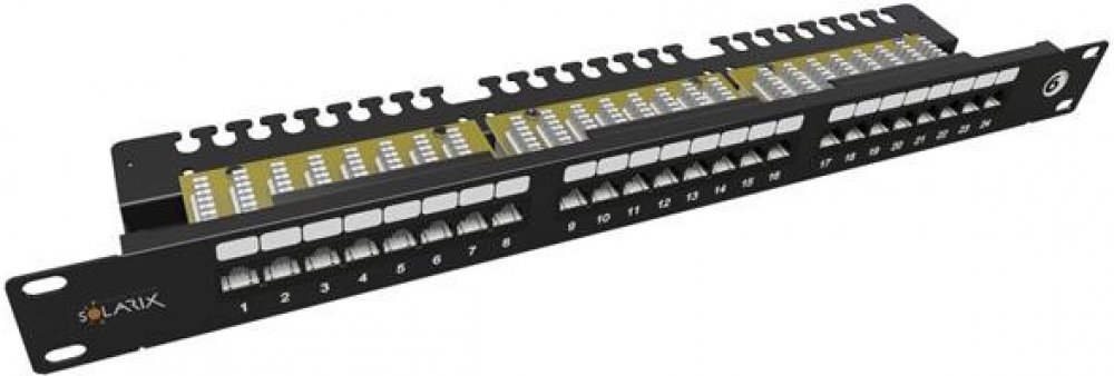 Patch panel Solarix SX24L-6-UTP-BK je nestíněný panel CAT6 osazený 24 porty RJ45. Důležitou součástí těla tohoto panelu je vyvazovací lišta, která slouží k pevnému uchycení kabelů. Instalační kabel se na tomto panelu produktové řady Solarix - CAT6 zakončuje do duální IDC svorkovnice typu 110/Krone – tj. k zařezání lze použít nástroj typu 110 i Krone. Svorkovnice panelu je označena podle standardu T568A i T568B. Stejně jako všechny ostatní komponenty strukturované kabeláže Solarix je i tento panel vyroben tak, aby poskytoval velmi dobrou funkčnost a vysokou spolehlivost. Tento patch panel splňuje požadavky na komponenty CAT6 definované ve standardech ANSI/TIA/EIA 568, EN 50173 a ISO 11801. Barva patch panelu je černá; velikost v datovém rozvaděči je 1U.