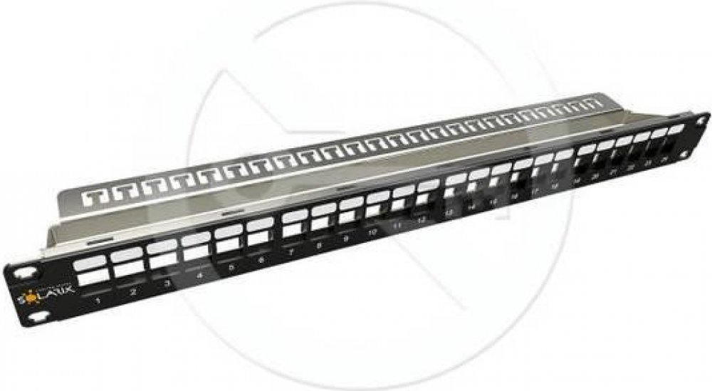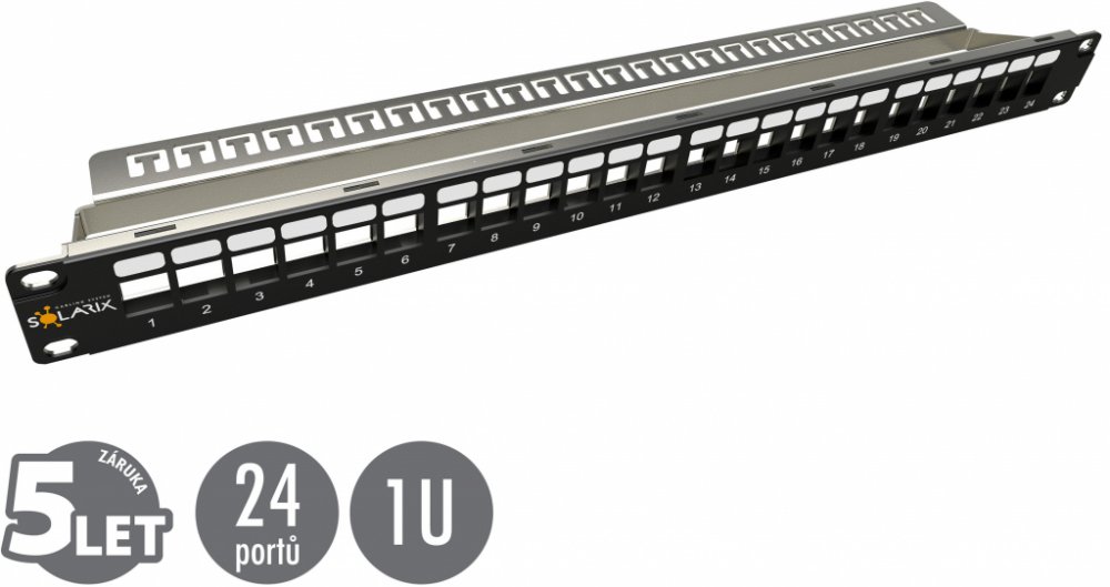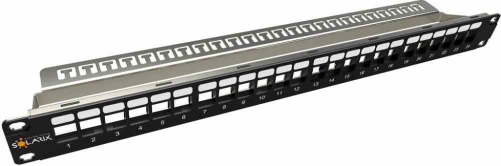 Patch panel Solarix s označením SX24M-0-STP-BK-UNI-N je univerzální neosazený patch panel, který je určený pro 24 stíněných i nestíněných keystonů Solarix SXKJ-xx-yyy-BK-SA a SXKJ-xx-yyy-BK-NA. Modulární provedení patch panelu umožňuje pohodlnou instalaci a díky vyvazovací liště, která je součástí dodávky panelu, i přehledné vyvázání a pevné uchycení datového kabelu přímo k tělu panelu. Tento patch panel je vybaven zemnícím drátem, který umožňuje jeho propojení se zemněním rozvaděče. Barva patch panelu je černá, vyvazovací lišty stříbrná, velikost v datovém rozvaděči je 1U. V případě potřeby je možné zaslepit volné porty panelu záslepkou SXKJ-0-BK. Rozměry otvorů pro keystone jsou u tohoto modulárního panelu Solarix 19,5±0,1 mm x 14,8±0,1mm (tj. dle ČSN EN 60603-7). Součástí balení je 4x M6 montážní sada, 24x vyvazovací pásek a 1x zemnící drát. Tento patch panel má čelo vyrobeno z vysokopevnostního plastu, které je nalisováno na kovovou kostru panelu.