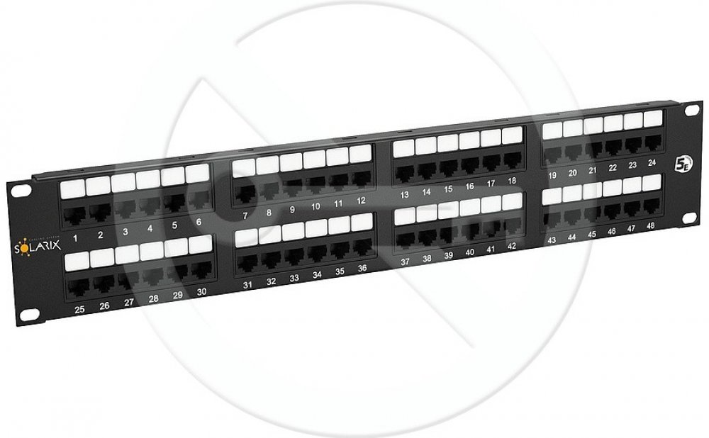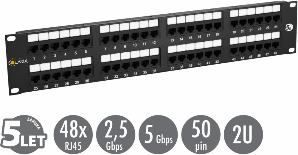 Nestíněné patch panely produktové řady Solarix – kategorie 5E jsou dodávány v provedení 12, 24 a 48 portů RJ45 a jsou osazeny moduly s duální IDC svorkovnicí typu 110/Krone. Každý kontakt je na této svorkovnici z důvodu snadného zakončení kabelu označen barvami podle typu zapojení, a to buď podle standardu T568A, nebo T568B. Tyto komponenty strukturované kabeláže Solarix jsou vyrobeny tak, aby zaručovaly dlouhou životnost, vynikající funkčnost a především spolehlivost. Nestíněné patch panely Solarix – kategorie 5E jsou testovány až do šířky pásma 150 MHz a převyšují tak požadavky na komponenty kategorie 5E definované v mezinárodních normách ANSI/TIA/EIA 568, ISO/IEC 11801 a EN 50173. Standardní barva patch panelů je černá. Velikost v datovém rozvaděči je 2U.