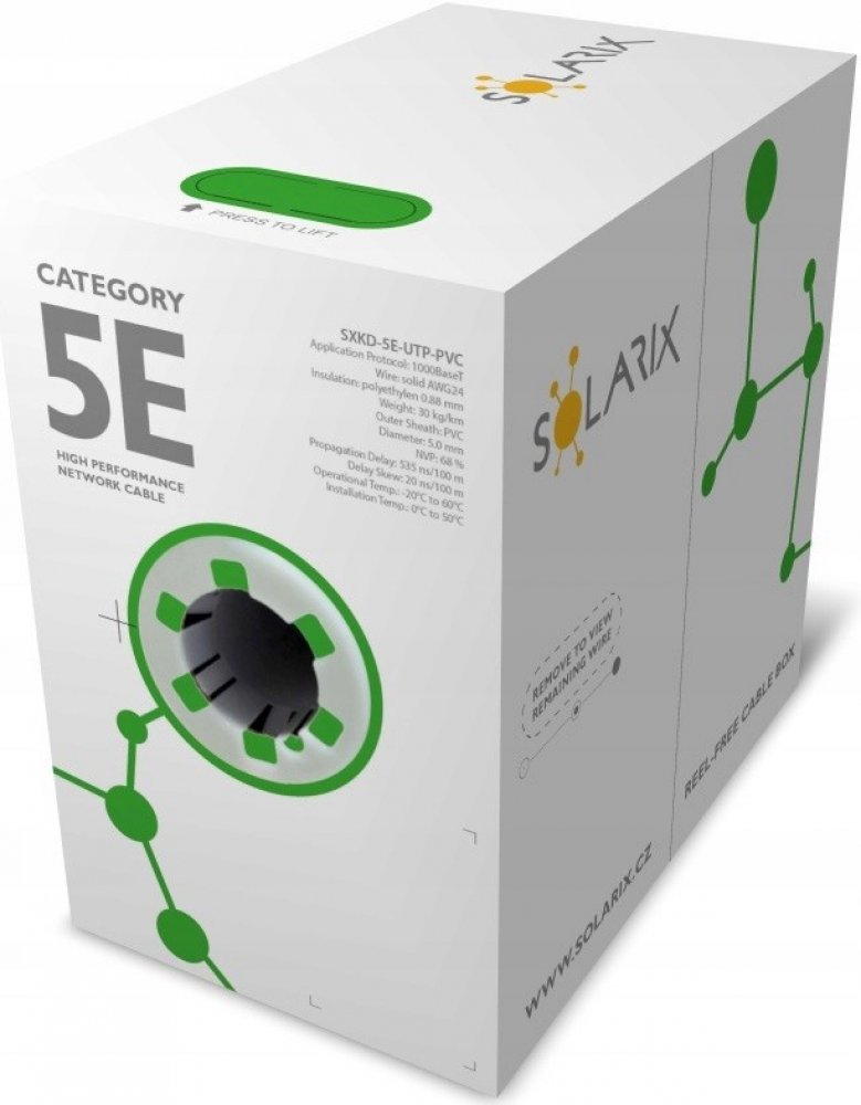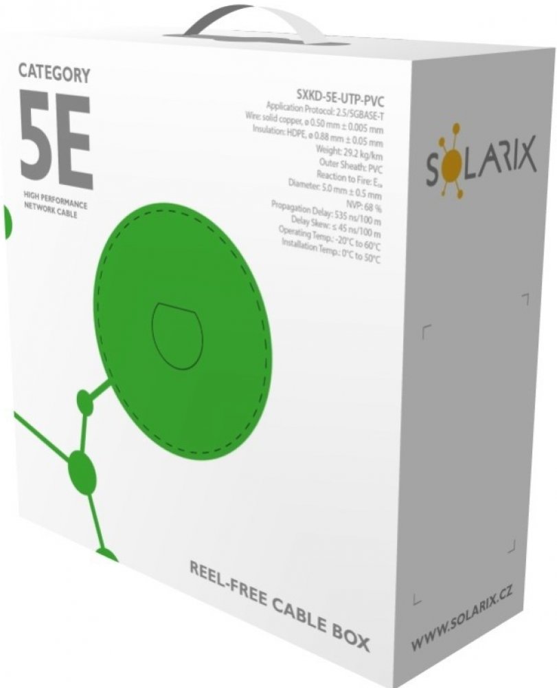 Šířka pásma [MHz]: 100Tento instalační kabel s označením SXKD-5E-UTP-PVC je spolehlivou součástí produktové řady Solarix - kategorie 5E. Společně s ostatními komponenty systému strukturované kabeláže Solarix vytváří řešení, které zaručuje dlouhou životnost, maximální výkon a bezproblémový chod počítačové sítě. Instalační kabely Solarix – kategorie 5E jsou určeny pro horizontální rozvody a jsou nabízeny ve stíněné i nestíněné verzi s různým typem pláště - tj. PVC, LSOH nebo UV stabilní PE. Tyto kabely bez problémů splňují požadavky definované v mezinárodních standardech ANSI/TIA/EIA 568, ISO/IEC 11801 a EN 50173 pro kategorii 5E a jsou vhodné i pro přenos dat rychlostí až 1 Gb/s (tj. gigabitový Ethernet).