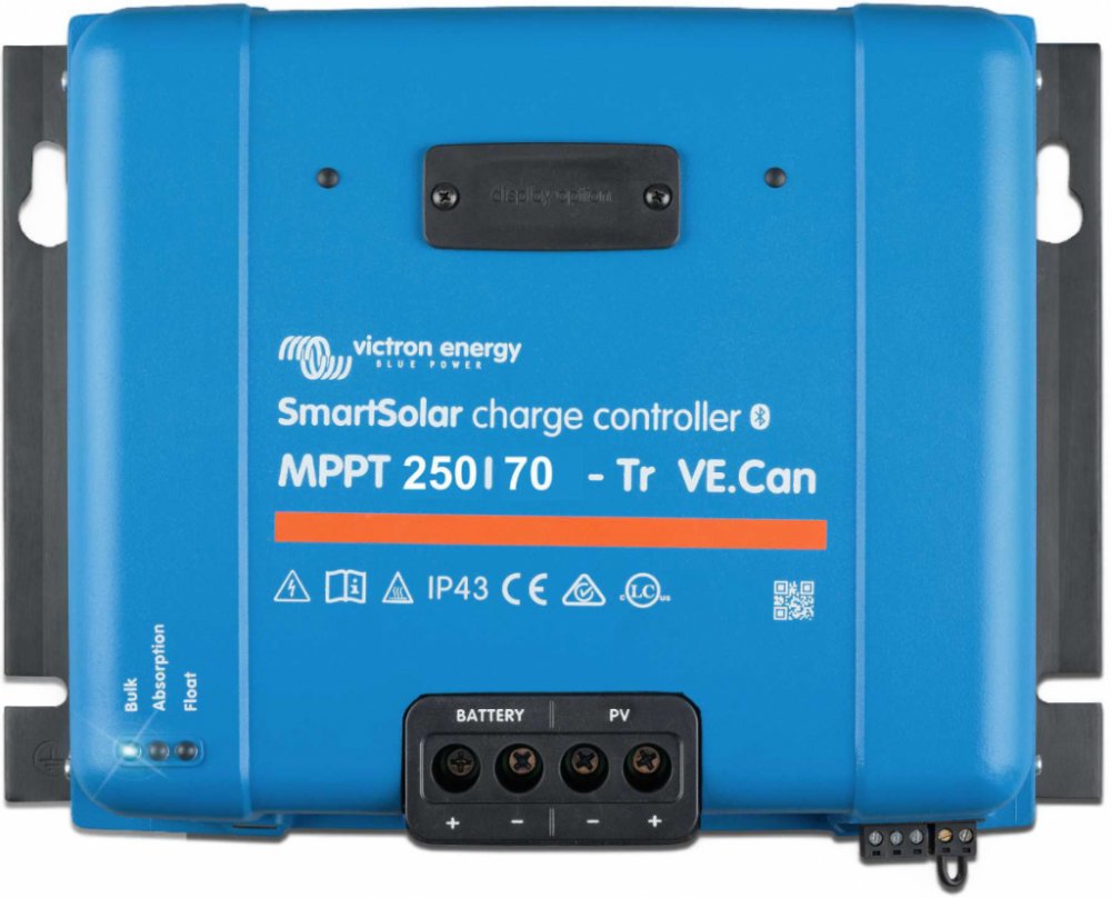 Tato výkonnější řada solárních regulátorů není vybavena DC výstupem. Pro připojení DC zátěže k baterii doporučujeme použít „Ochranu baterií BP“ s maximálním proudem zátěže až 220A.Robustní a rychlý MPPT regulátor s VE.Can pro náročné podmínky s napětím panelů až 250 V, nabíjecí proud 70 A. Baterie 12/24/48V, FV max 1000/2000/4000Wp. Vestavěný Bluetooth a konektor pro zásuvný displej.