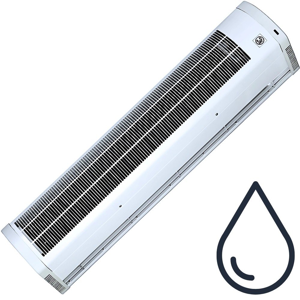 Vzduchová dveřní clona - max. výška 3 m, hlučnost 50 dB, vodní ohřev, barva bílá, z galvanizované oceli, max. průtok 2800 m³/h, lze instalovat v sérii, ventilátor - tangenciální, počet rychlostí 3, příkon 0,18 kW, umístění (do - večerky / obchodu / komerčních prostor / garáží / menších provozoven), vyvážené oběžné kolo, na strop / stěnu, max. proud 0,8 A, rozměry 1686 × 210 mm (Š×V), hmotnost 25 k...