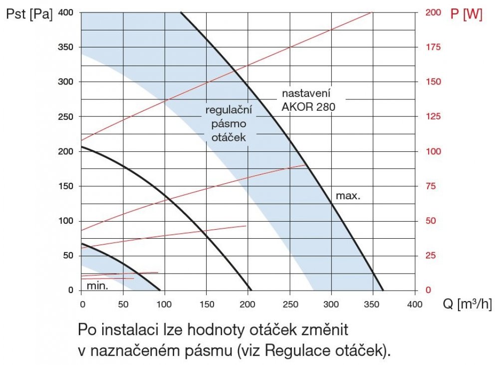 V tabulce a grafu je znázorněno tovární nastavení otáček, ty lze ale po montáži přizpůsobit dle potřeby. Jednotka je vybavena dvěma potenciometry, kterými lze nastavit hodnotu vysokých a nízkých otáček. Střední otáčky jsou pak průměrem hodnoty vysokých a nízkých otáček. Pro nejvyšší otáčky lze nastavit doběh od 10, 20 nebo 30 min, pokud je použit bezdrátový přepínač otáček typu RFT Akor, který je standardním volitelným příslušenstvím. Přepínač pracuje na frekvenci 868 MHz s maximálním dosahem 100 m ve volném prostoru. V případě změny připojovacího kabelu na pětižilový (součást dodávky) lze zajistit ovládání přepínačem SA 1–3V (nebo obdobným). V tomto zapojení lze použít pro nezávislé spuštění nejvyšších otáček čidlo kvality vzduchu AIRSENS, pokojový termostat nebo programovatelný časový spínač DT 3R, DT 4 nebo DT 8-R, které přivedou fázové napětí ze stejné napájecí fáze na ovládací svorku (toto řešení je zákaznické a není součástí dodávky). Plná funkce mikroprocesorové regulace nastává 24 h po zapnutí a ustálení parametrů.