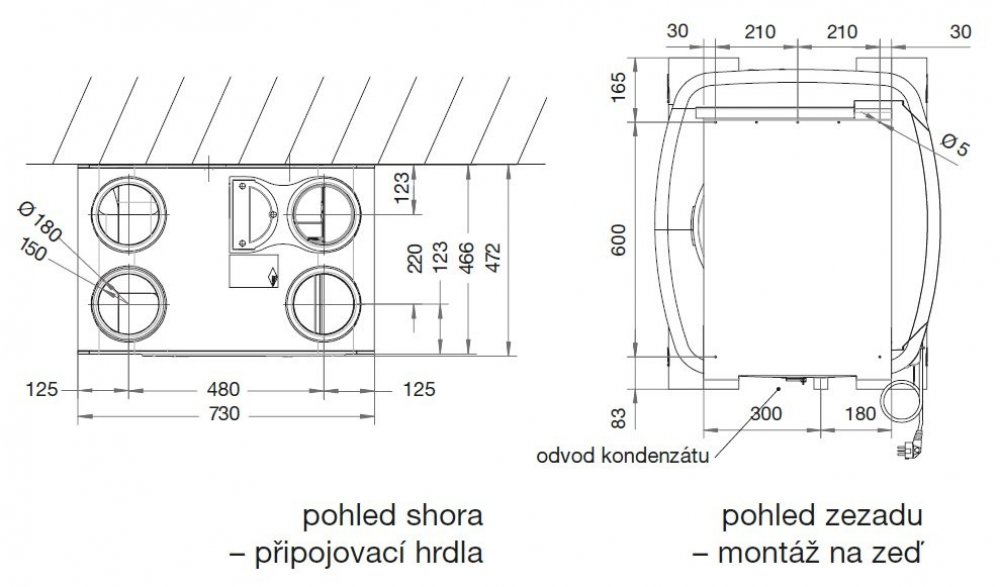 Montáž pouze ve svislé poloze s volným prostorem před jednotkou, aby bylo možné otevřít víko a vyjmout filtry nebo výměník pro čištění. Připojení odvodu kondenzátu se provede přes sifonový pachový uzávěr.