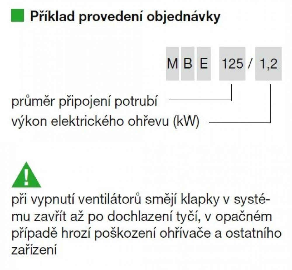 UpozorněníPři vypnutí VZT systému musí být pro ochlazení topných tyčí zajištěn doběh ventilátoru se zpožděním minimálně 2 minuty. V opačném případě hrozí poškození ohřívače a ostatních zařízení.