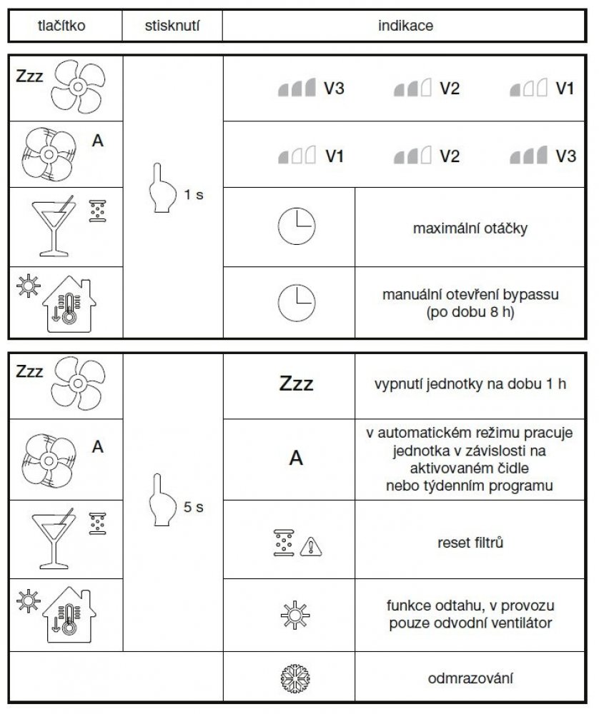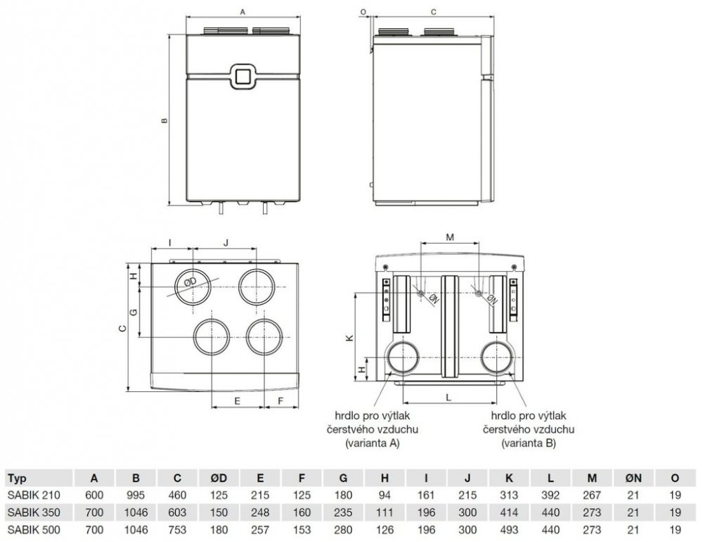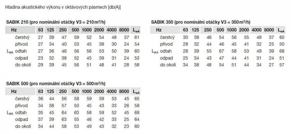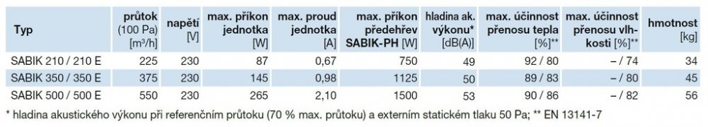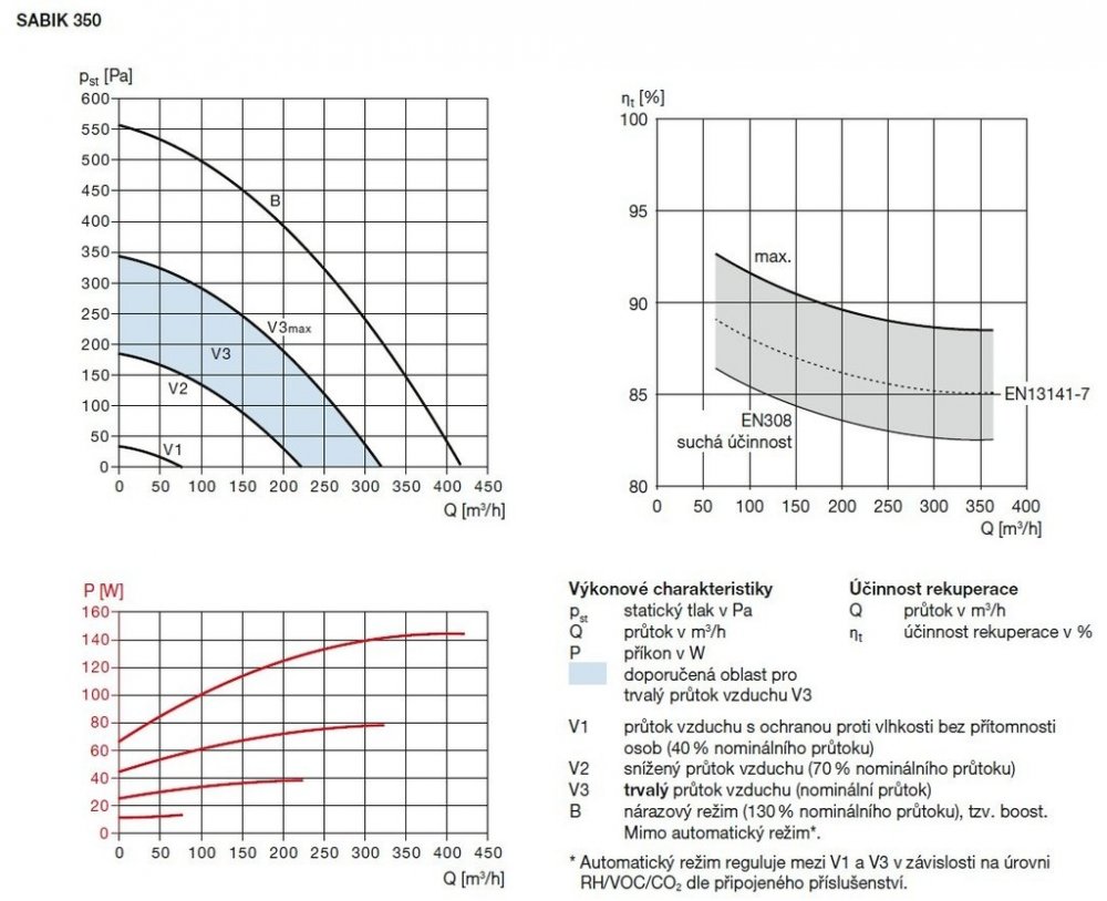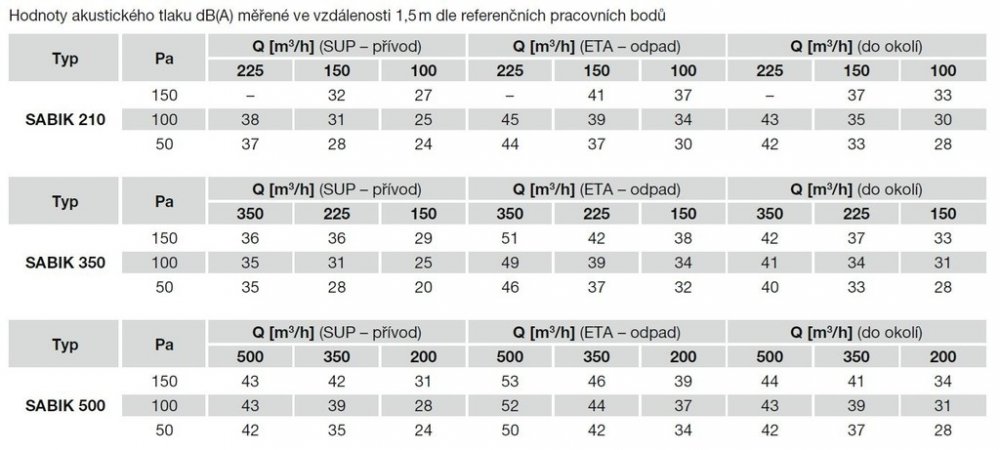 SABIK 350 Rezidenční Rekuperační JednotkaSkříň Skříň je vyrobena z galvanicky pozinkovaného ocelového plechu a je nalakována práškovou barvou v šedobílé kombinaci. Vnitřní konstrukce je z vysoce kvalitního EPP. Na horní straně jednotky jsou čtyři hrdla o průměru dle velikosti jednotky. Jednotka SABIK má navíc hrdlo pro výtlak čerstvého vzduchu na spodní straně skříně. Pravé nebo levé provedení lze získat přepnutím přepínače na řídicí elektronice jednotky (po sejmutí předního krytu).Ventilátory Na výtlaku a sání jsou radiální ventilátory s dozadu zahnutými lopatkami.Motor Jednofázové EC motory 230 V / 50 Hz.Rekuperace Plastový protiproudý výměník s teplotní účinností až 94 %. Výměník je přístupný po demontáži čelní stěny jednotky. Pro letní provoz je jednotka vybavena obtokem výměníku.Filtr Na sání čerstvého vzduchu je standardně deskový filtr G4 (ISO coarse 65%). Jako příslušenství lze dodat F7 (ISO ePM1 50%). Na sání odpadního vzduchu je standardně deskový filtr G4.Elektrické Připojení Jednotka je určena pro přímé napojení síťovou zástrčkou do zásuvky. Napájení je jednofázové 230 V / 50 Hz.Regulace Jednotka je vybavena plně automatickým řídicím systémem, který v kombinaci se čtyřmi senzory teploty a relativní vlhkosti zajišťuje plynulou regulaci otáček dle aktuálního požadavku, bez nutnosti dalšího zásahu do ovládání jednotky. Ve výkonových charakteristikách jsou vyznačeny křivky pro jednotlivé otáčky (podrobnosti viz návod k obsluze). Designový drátový ovladač umožňuje manuální přepínání otáček ventilátorů, ovládání by-passu, zapnutí funkce BOOST, aktivaci automatického provozu, nočního vychlazování a signalizaci zanesení filtrů. Další nastavení jednotky se provádí pomocí DIP přepínačů a potenciometrů na řídicí elektronice jednotky (po sejmutí předního krytu). Jednotka má čtyři přednastavené týdenní programy, z nichž jeden umožňuje automatický provoz od čidla vlhkosti, vestavného senzoru VOC (volitelné příslušenství) nebo nadřazeného analogového signálu 0-10 V. Jednotka zajišťuje provoz až do venkovní teploty -15 °C s vestavným předehřevem. Jednotky SABIK lze doplnit o vestavný modul zajišťující regulaci na konstantní průtok vzduchu SABIK-NEMBUS-SF. Přes externí modul SPCM je možné připojení ke ConnectAir (cloud S&P).Hluk V tabulkách je uveden akustický tlak měřený ve volném akustickém poli ve vzdálenosti 1,5 m.Montáž Jednotka je určena k vertikální montáži do vnitřních prostor s minimální teplotou 12 °C, montáž na stěnu (součástí dodávky jsou držáky pro upevnění na stěnu). Pro zajištění většího odsazení od stěny je k dispozici volitelná montážní konzole SABIK-WMC. Jednotka musí být namontována tak, aby byl zajištěn dostatek prostoru pro otevření víka jednotky, výměnu filtrů, připojení odvodu kondenzátu (DN20) na odpad se sifonovým pachovým uzávěrem a pro provádění periodických revizí elektroinstalace.Pokyny Jednotku lze vybavit vestavným předehřevem SABIK-PH. V případě požadavku na dohřev přívodního vzduchu lze použít potrubní ohřívače MBE a MBW s odpovídajícími regulačními prvky.Informace Malá jednotka určená do bytové výstavby nebo do rodinných domů. Vyznačuje se jednoduchou montáží, minimálními nároky na ovládání a údržbu a velice úsporným provozem. Snadné přepnutí mezi levým a pravým provedením. Všechny jednotky jsou certifikovány systémem „Passive House“.