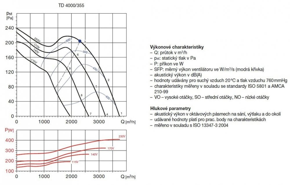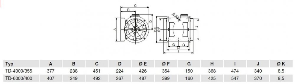 Potrubní kruhový ventilátor TD 4000/355 je určený pro spojení se vzduchotechnickým kruhovým potrubím. Tichý ventilátor z řady TD MIXVENT je vyroben z ocelového galvanizovaného plechu opatřeného epoxydovým lakem, velkou výhodou je demontáž motorové části ventilátoru bez nutnosti odpojení vzduchotechnického potrubí. Dvoutáčkový ventilátor je možné regulovat změnou napětí. Ventilátor je vhodný pro odsávání větší koupelny, garáže, dílen. Montáž ventilátoru je možná v každé poloze. Skříň nesmí přenášet mechanické namáhání z potrubních rozvodů, doporučujeme použít kruhové pružné připojení VBM.Skříň ventilátoruSkříně ventilátorů TD-160 až TD-800 jsou vyrobeny z plastu, modely TD-1000 až TD-6000 jsou vyrobeny z ocelového galvanizovaného plechu opatřeného epoxidovým lakem. Skříň se skládá z montážní lišty s dvěma hrdly a motoru. Konstrukce umožňuje demontáž motorové části bez nutnosti odpojit potrubí.Oběžné kolo ventilátoruOběžná kola ventilátorů TD-160 až TD-800 jsou vyrobena z nárazuvzdorného plastu, oběžná kola TD-1000 až TD-6000 jsou vyrobena z hliníku.Motor ventilátoruStřídavé motory ve ventilátorech TD-160 až TD-350 mají dvojí vinutí, což umožňuje provoz s dvojími otáčkami. Ventilátory TD- 500 až TD-2000 mají trojí vinutí. TD-4000 a TD-6000 mají jedno vinutí, je možné je regulovat změnou napětí. Motory jsou vybaveny tepelnou pojistkou (TD 160–TD 350) nebo tepelnou ochranou (TD 500–TD 6000). Ložiska jsou kuličková s tukovou náplní na dobu životnosti. Třída izolace B, krytí IP44 (TD 250, 350, 800–2000), třída izolace F, krytí IP44 (TD 500), třída izolace F, krytí IP54 (TD 4000, 6000). Ventilátory TD a TD-T jsou pro napětí 230 V, krom TD 4000 TRIF (230/400 V) a TD 6000 TRIF, kde je napájecí napětí 400 V.Svorkovnice ventilátoruSvorkovnice je umístěna na skříni ventilátoru, u některých typů obsahuje rozběhový kondenzátor.Regulace otáček ventilátoruU střídavých motorů s dvojím vinutím (TD 160–350) se otáčky přepínají ve dvou stupních pomocí regulátorů REGUL 2 nebo COM 2 nebo změnou napětí regulátory REB (plynulá regulace) nebo REV (pětistupňová regulace). U motorů s trojím vinutím (TD 500 – TD 2000) se otáčky přepínají ve třech stupních pomocí regulátorů COM 3 nebo INT 4P nebo lze použít regulaci změnou napětí regulátory REB (plynulá regulace) nebo REV (pětistupňová regulace). TD 4000 a 6000 se dají regulovat pouze změnou napětí. TD 4000 a 6000 TRIF se dají regulovat změnou napětí nebo frekvenčními měniči. TD-T s jedním vinutím a vestavěným doběhem nelze regulovat.Montáž ventilátorů je možná v každé poloze ventilátoru. Skříň nesmí přenášet mechanické namáhání z potrubních rozvodů. Je nutné použít pružné připojení k potrubí.