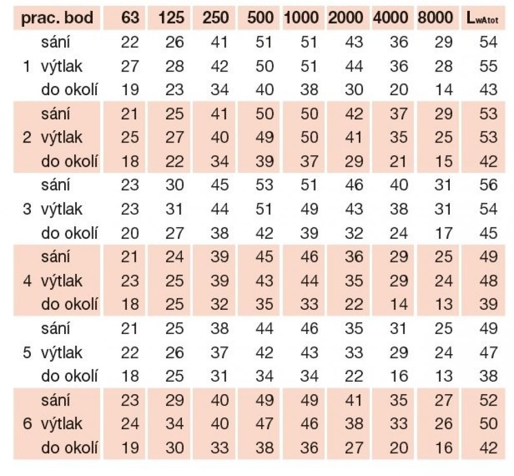 vysoké/nízké otáčky, * akustický tlak vyzářený do okolí je měřen ve vzdálenosti 3 m ve volném poli s připojeným potrubím na straně sání i výtlaku