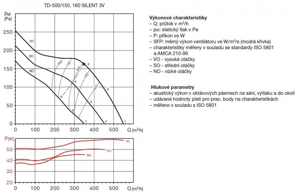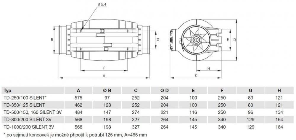 Skříň je z plastu, skládá se z konzole pro montáž na zeď nebo strop, hlukového absorbéru a motoru. Snadná demontáž motorové části, připevněné pomocí rychloupínacích spon. Připojovací hrdla s gumovým těsněním. Svorkovnice je na skříni ventilátoru, je otočná o 360° pro připojení kabelu z libovolného směru. U motorů s trojími otáčkami (TD 500–1000 SILENT 3V) se regulace provádí pomocí COM 3 nebo INT 4P případně regulátory REB (plynulá regulace) nebo REV (pětistupňová regulace). Montáž ventilátoru je možná v každé poloze ventilátoru. Skříň nesmí přenášet mechanické namáhání z potrubních rozvodů. Je nutné použít pružné připojení k potrubí. Parametry:- průtok vzduchu: 550/450/350 m3/h- otáčky: 2480/2060/1610 ot./min- průměr potrubí: 150/160 mm- výkon: 59/50/45 W- napětí: 230 V- proud: 0,26/0,22/0,20 A- hlučnost: 22/17 db(A)- max. teplota: 60 °C Návod k obsluze zde: návod TD SilentKatalog s informacemi o produktu: katalog TD Silent Rozměry (v mm):*nákres ventilátoru naleznete ve fotogalerii