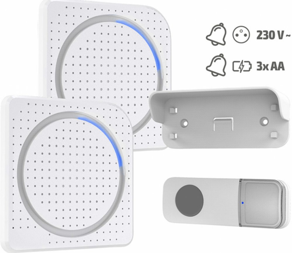 Jeden bezdrátový zvonek stačí zapojit do běžné zásuvky, není potřeba žádné vrtání ani tahání kabelů. Druhý lze podle libosti přenášet, na zahradu, do dílny, či do skladu. Dosah až 200 metrů v otevřeném prostoru zaručuje bezproblémové fungování ve větších domech, provozovnách a díky zvonku na baterie i venkovních prostorech. Oba přijímače jsou spárovány s tlačítkem a zvyšují pokrytí prostoru signálem. Vysílač je napájen baterií a snadno se upevní na zeď nebo dveře. Stříška vysílače zvyšuje odolnost proti dešti a zároveň chrání před přímým slunečním světlem, to prodlužuje jeho životnost.