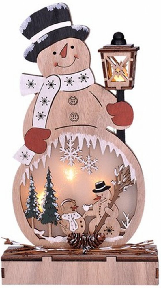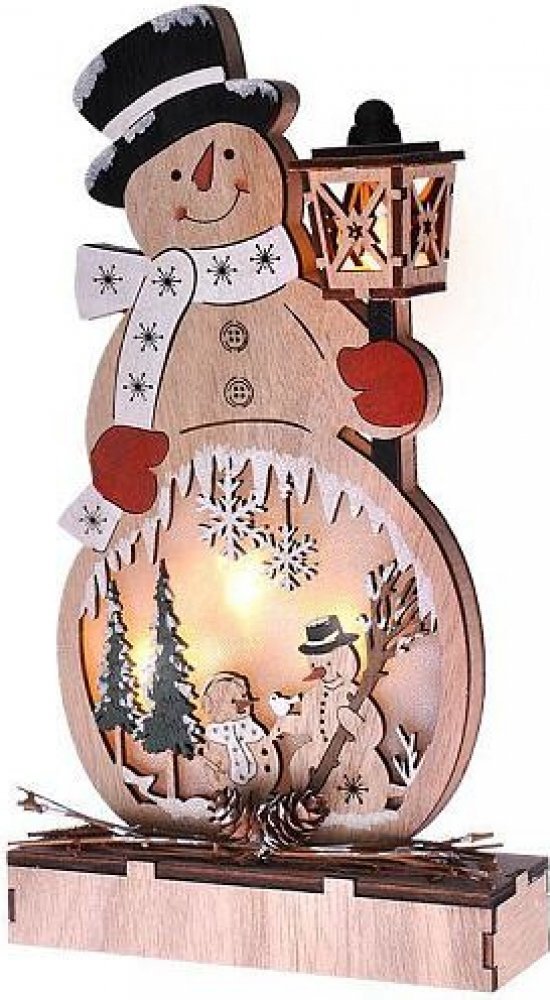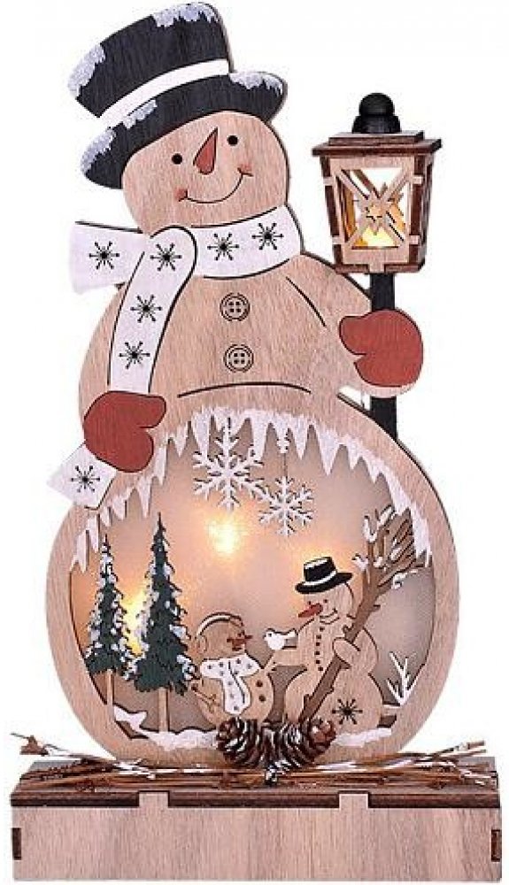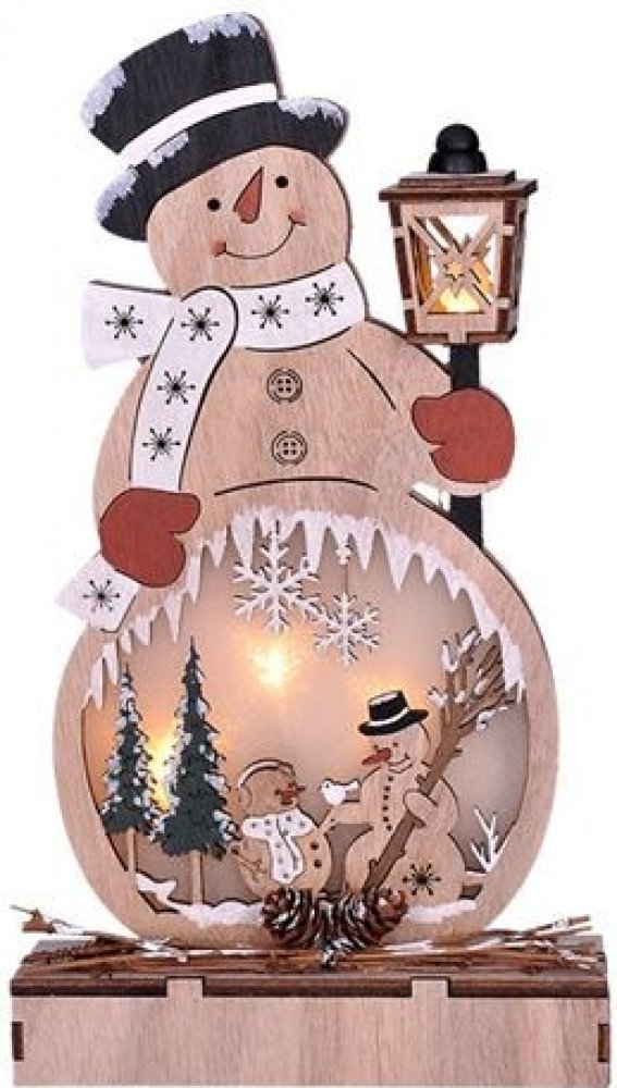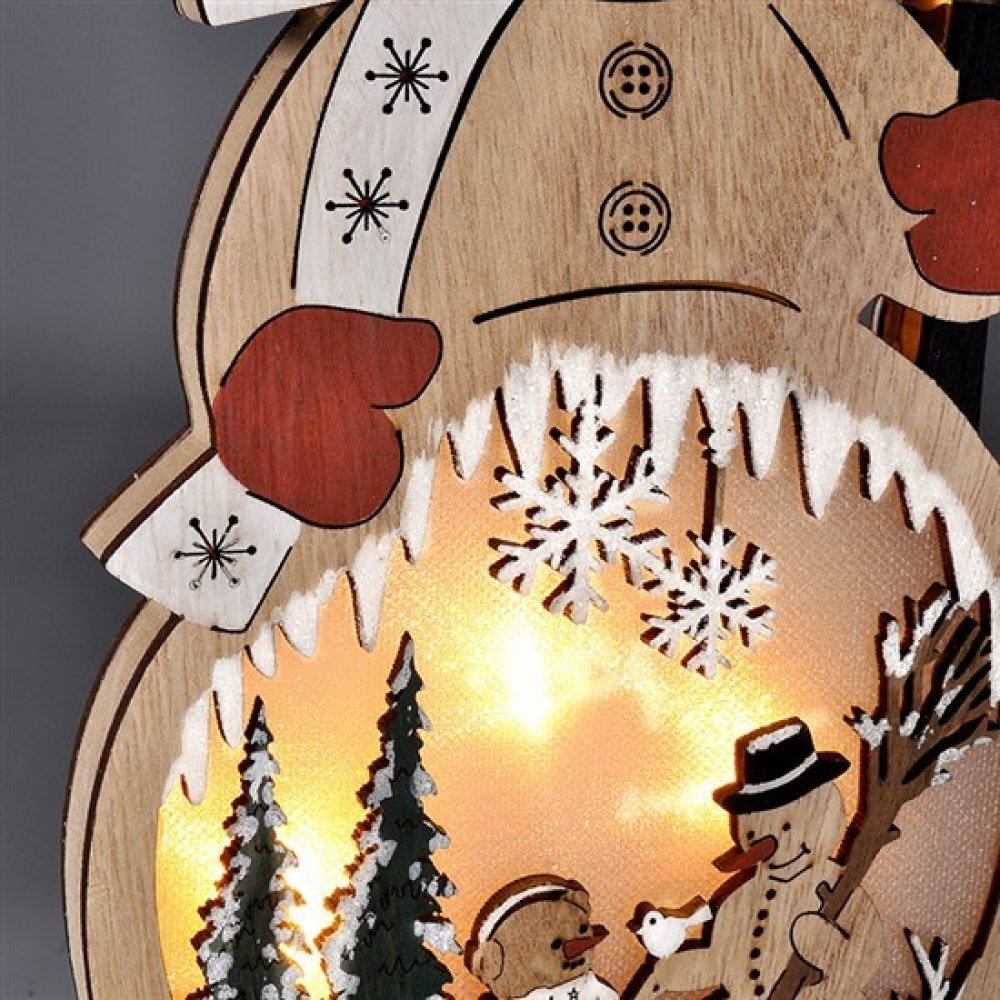 Dřevěná dekorace ve tvaru sněhuláka s LED osvětlením je hravým doplňkem vánoční výzdoby. Vyroben z přírodního dřeva a vybaven čtyřmi LED diodami v teplé bílé barvě vytváří příjemnou atmosféru v každém interiéru. Rozměr 29 × 16 × 5 cm je ideální pro vystavení na komodě, okenním parapetu nebo poličce. Napájení dvěma AA bateriemi (nejsou součástí) vydrží cca 100 hodin, v závislosti na kvalitě bateri