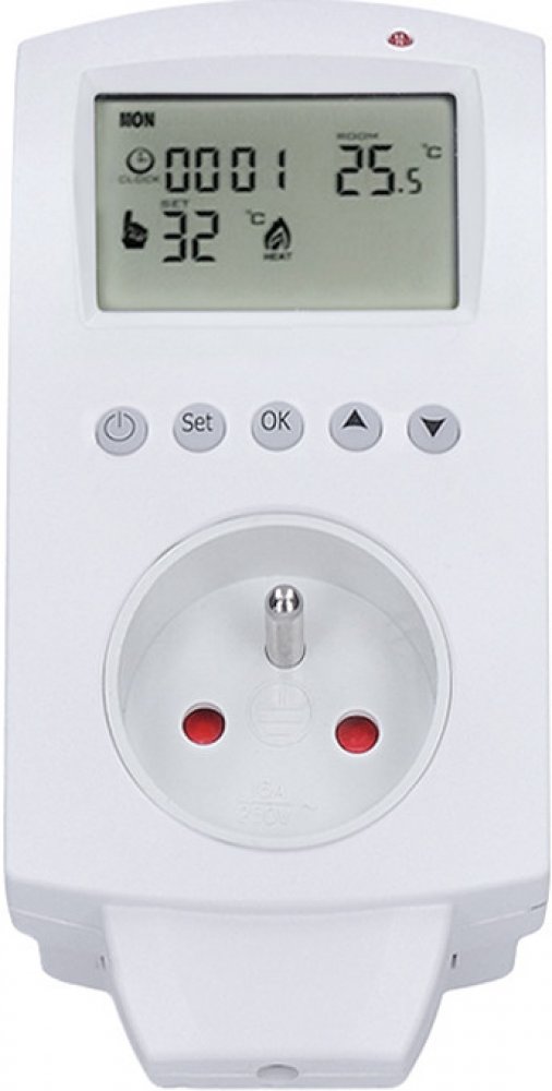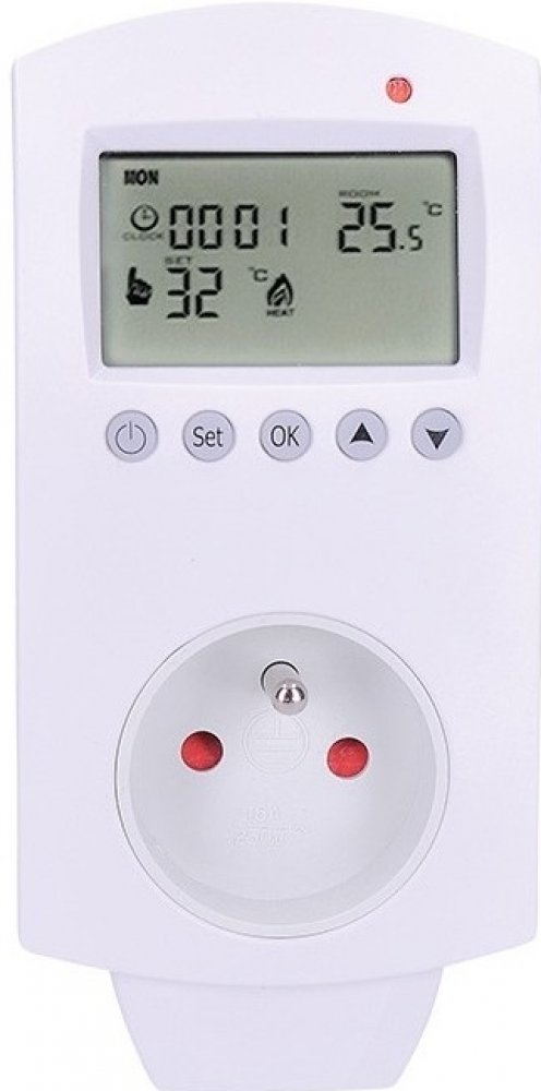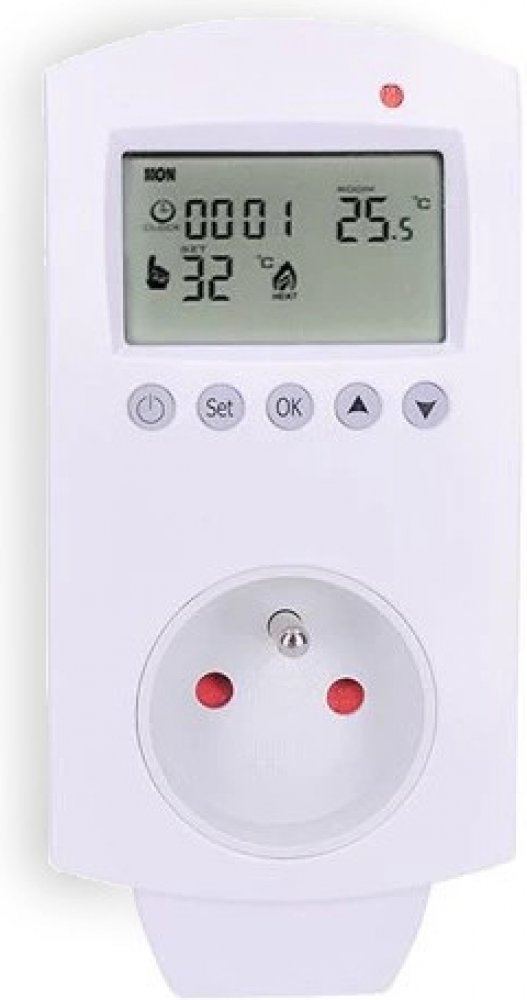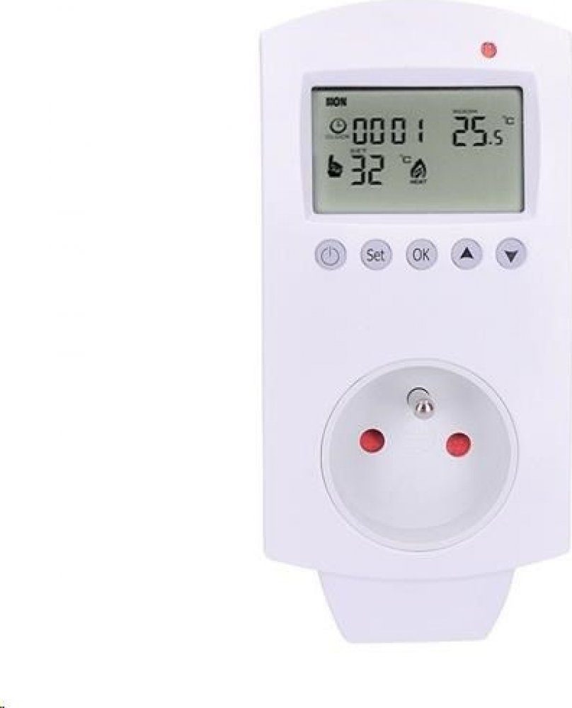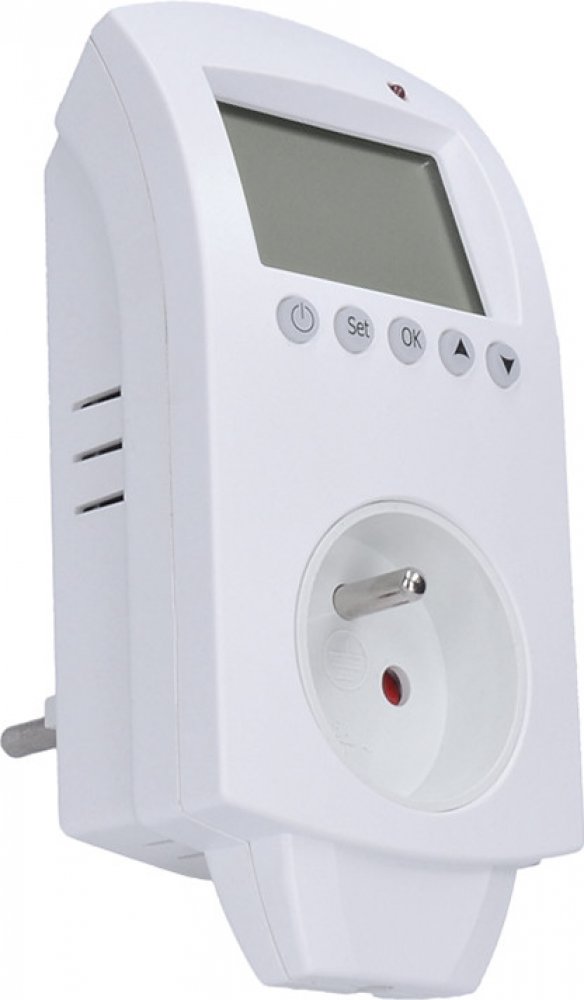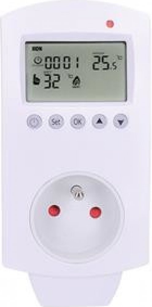 Termostaticky spínaná programovatelná zásuvka pro vnitřní použití, spíná při dosažení nastavené teploty