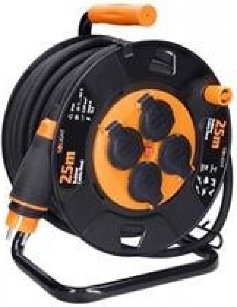 25m prodlužovací kabel s robustní konstrukcí navijáku a cívkou z odolného plastu. Vodicí oko zajišťuje plynulé navinutí kabelu a šetří tak čas i nervy. Prodloužená zástrčka s gumovou protiskluzovou rukojetí usnadňuje manipulaci i v rukavicích.