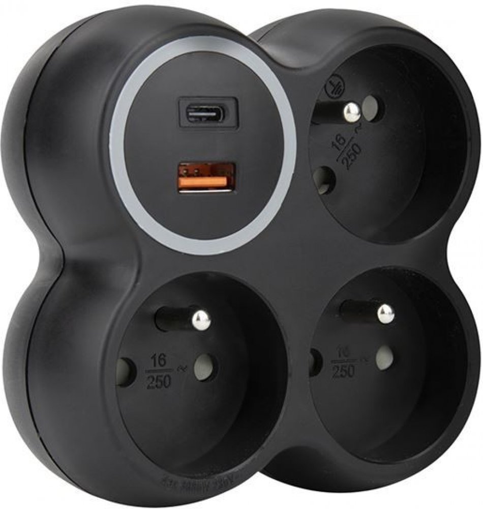 - zásuvky 3x 15A max. 3500W, 15A/230V~ pootočená horní zásuvka velký podsvětlený vypínač USB A+C rychlonabíjecí adaptér, USB-C Power Delivery USB-A QC 3.0: 5.0V/3.0A, 9.0V/2.0A, 12.0V/1.5A,18W USB-C PD: 5.0V/3.0A, 9.0V/2.22A, 12.0V/1.67A, 20W PD dětské pojistky v zásuvkách barva: matná černá